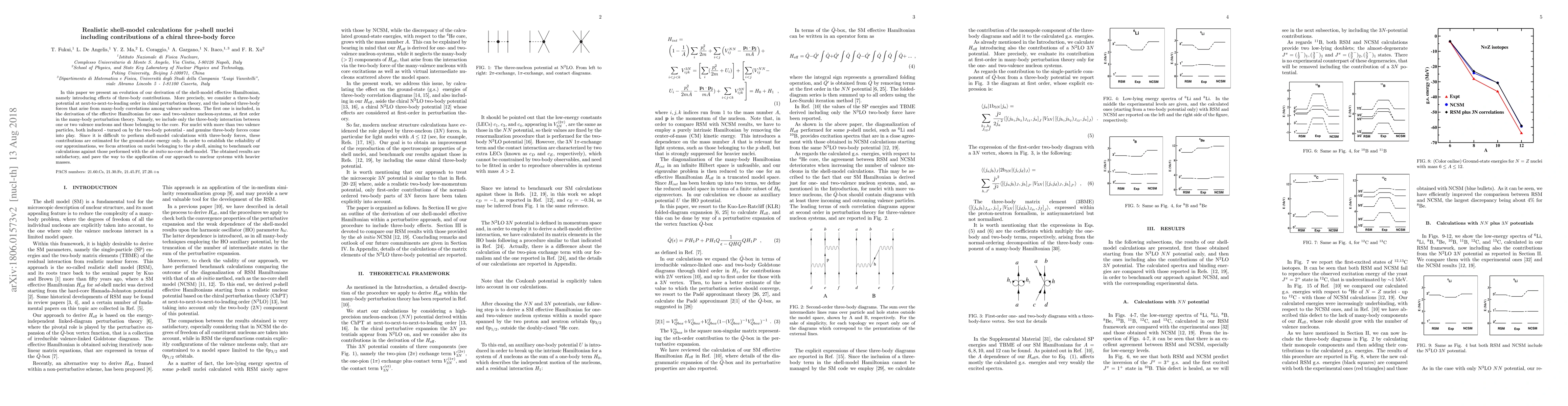 In this paper we present an evolution of our derivation of the shell-model effective Hamiltonian, namely introducing effects of three-body contributions. More precisely, we consider a three-body potential at next-to-next-to-leading order in chiral perturbation theory, and the induced three-body forces that arise from many-body correlations among valence nucleons. The first one is included, in the derivation of the effective Hamiltonian for one- and two-valence nucleon-systems, at first order in the many-body perturbation theory. Namely, we include only the three-body interaction between one or two valence nucleons and those belonging to the core. For nuclei with more than two valence particles, both induced - turned on by the two-body potential - and genuine three-body forces come into play. Since it is difficult to perform shell-model calculations with three-body forces, these contributions are estimated for the ground-state energy only. In order to establish the reliability of our approximations, we focus attention on nuclei belonging to the p shell, aiming to benchmark our calculations against those performed with the ab initio no-core shell-model. The obtained results are satisfactory, and pave the way to the application of our approach to nuclear systems with heavier masses.