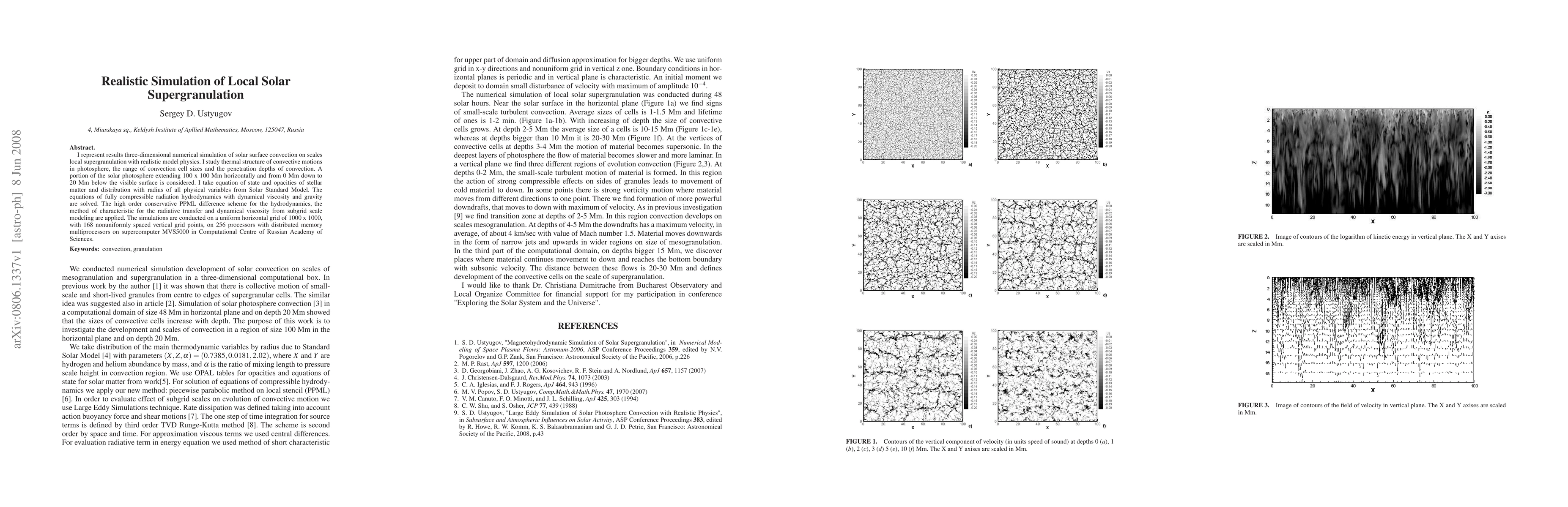 This paper presents a three-dimensional numerical simulation of solar surface convection on local supergranulation scales using realistic model physics. The study investigates the thermal structure, convection cell sizes, and penetration depths in the solar photosphere, employing advanced hydrodynamics and radiative transfer methods on a supercomputer.