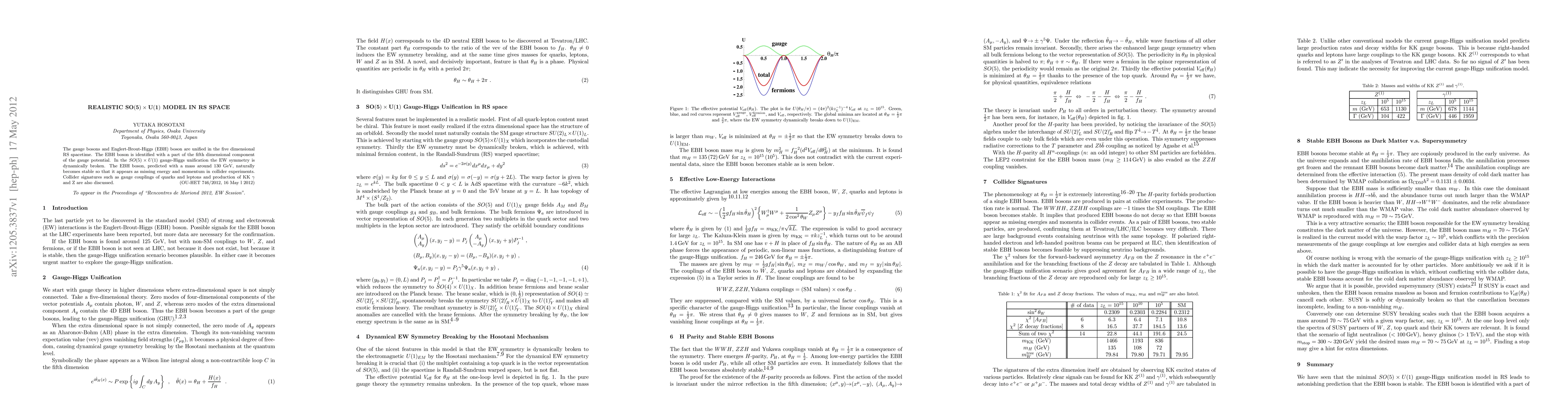 This paper proposes a realistic SO(5) x U(1) model in RS space where gauge bosons and the Englert-Brout-Higgs boson are unified, dynamically breaking EW symmetry and predicting the EBH boson's stability around 130 GeV, which appears as missing energy in collider experiments. It also discusses collider signatures including gauge couplings and production of Kaluza-Klein photons and Z bosons.