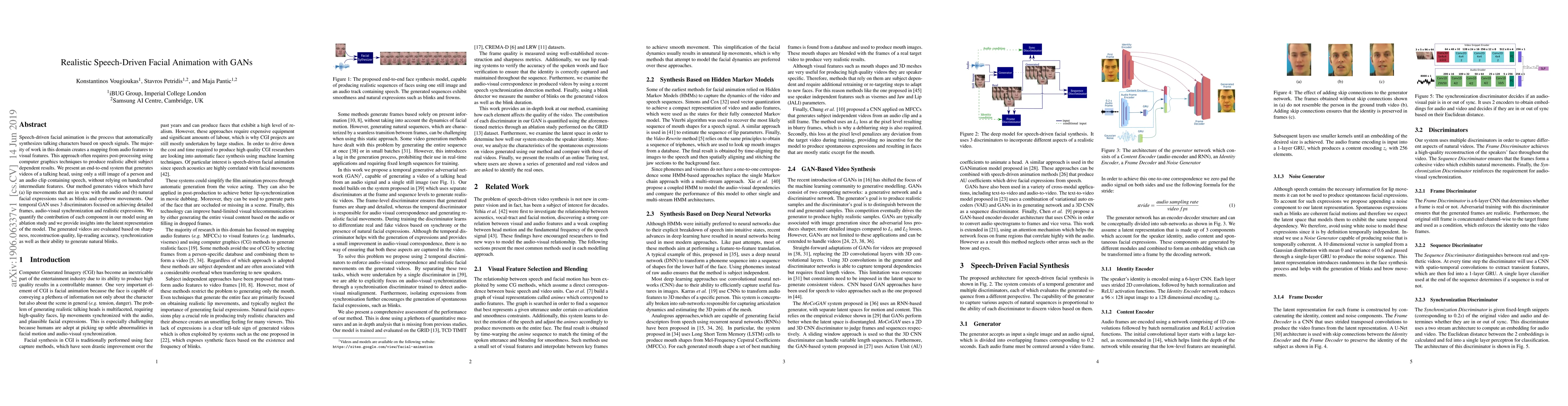 This paper presents an end-to-end system using a temporal GAN to generate realistic speech-driven facial animations from a still image and audio clip, achieving lip synchronization and natural expressions without intermediate features. The model's effectiveness is evaluated based on sharpness, synchronization, and naturalness of facial movements.