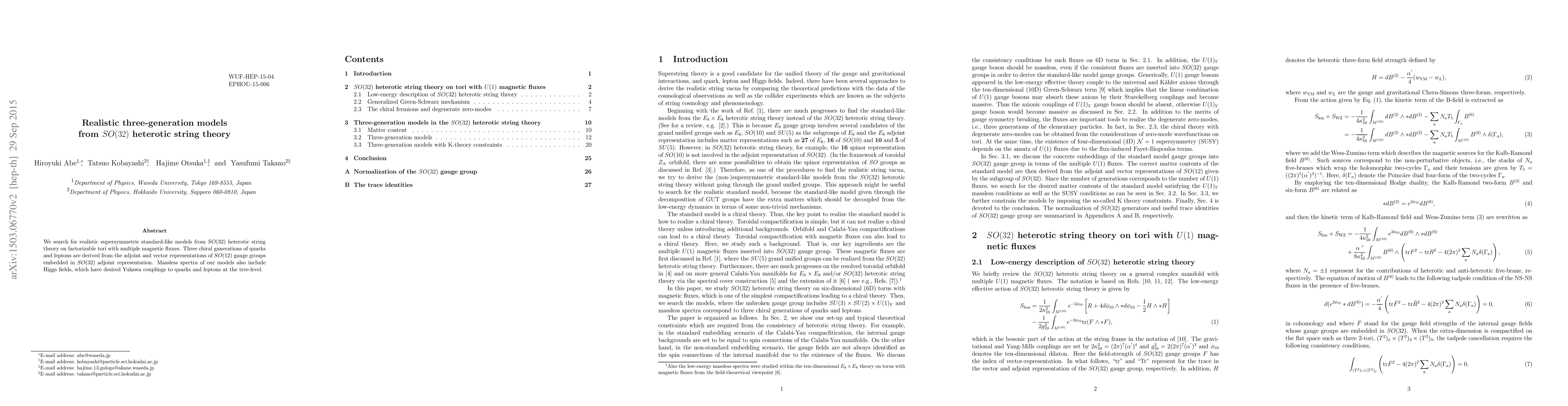 The paper presents a detailed derivation of realistic three-generation models from SO(32) heterotic string theory, incorporating magnetic fluxes, Wilson lines, and U(1) flux configurations to achieve chiral fermions and standard model gauge groups.