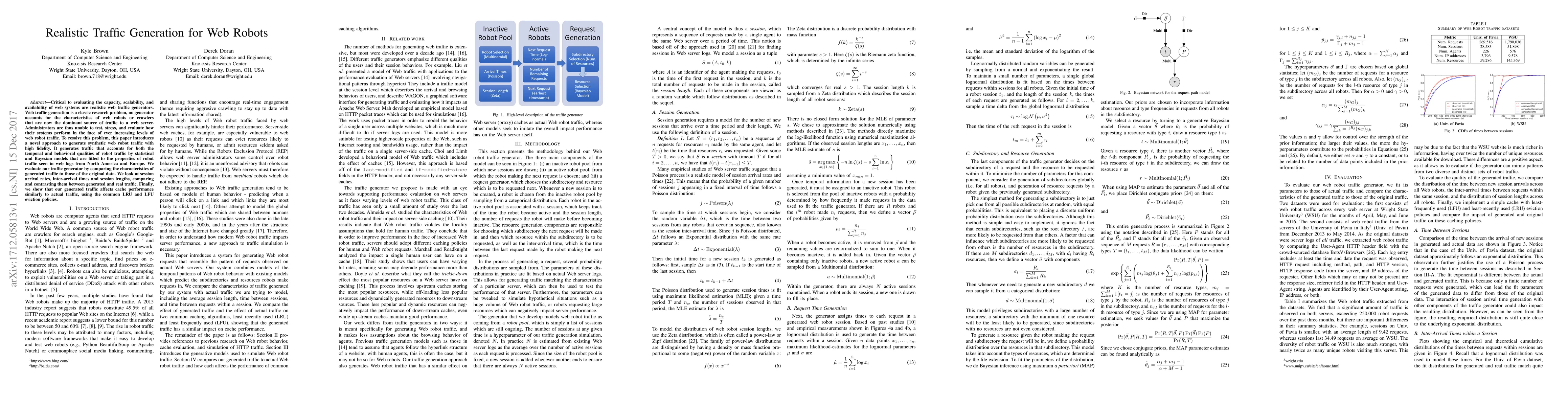 This paper introduces a novel method for generating realistic synthetic web robot traffic, addressing the lack of existing generators that account for robot characteristics. It employs statistical and Bayesian models fitted to real web log data to replicate temporal and behavioral qualities of robot traffic, demonstrating its effectiveness through comparisons with actual traffic and cache performance tests.
