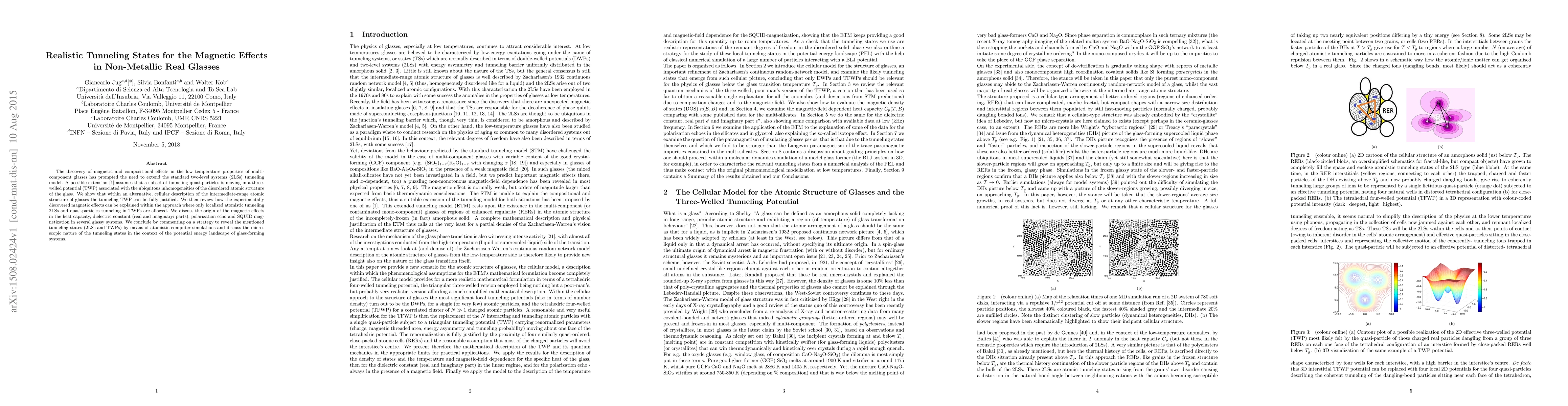 The discovery of magnetic and compositional effects in the low temperature properties of multi-component glasses has prompted the need to extend the standard two-level systems (2LSs) tunneling model. A possible extension \cite{Jug2004} assumes that a subset of tunneling quasi-particles is moving in a three-welled potential (TWP) associated with the ubiquitous inhomogeneities of the disordered atomic structure of the glass. We show that within an alternative, cellular description of the intermediate-range atomic structure of glasses the tunneling TWP can be fully justified. We then review how the experimentally discovered magnetic effects can be explained within the approach where only localized atomistic tunneling 2LSs and quasi-particles tunneling in TWPs are allowed. We discuss the origin of the magnetic effects in the heat capacity, dielectric constant (real and imaginary parts), polarization echo and SQUID magnetization in several glassy systems. We conclude by commenting on a strategy to reveal the mentioned tunneling states (2LSs and TWPs) by means of atomistic computer simulations and discuss the microscopic nature of the tunneling states in the context of the potential energy landscape of glass-forming systems.