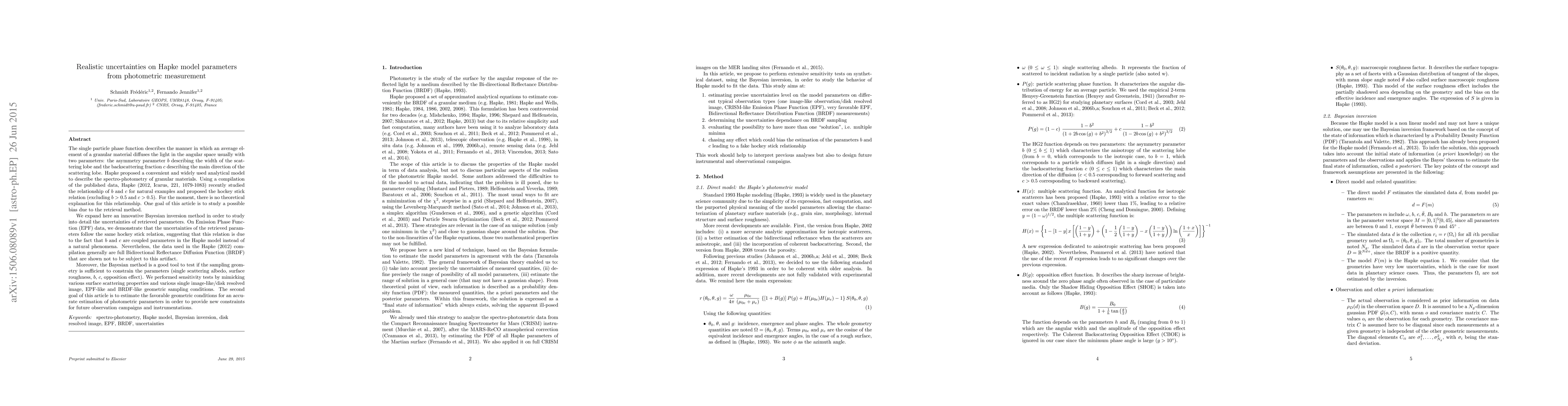 Hapke proposed a convenient and widely used analytical model to describe the spectro-photometry of granular materials. Using a compilation of the published data, Hapke (2012, Icarus, 221, 1079-1083) recently studied the relationship of b and c for natural examples and proposed the hockey stick relation (excluding b>0.5 and c>0.5). For the moment, there is no theoretical explanation for this relationship. One goal of this article is to study a possible bias due to the retrieval method. We expand here an innovative Bayesian inversion method in order to study into detail the uncertainties of retrieved parameters. On Emission Phase Function (EPF) data, we demonstrate that the uncertainties of the retrieved parameters follow the same hockey stick relation, suggesting that this relation is due to the fact that b and c are coupled parameters in the Hapke model instead of a natural phenomena. Nevertheless, the data used in the Hapke (2012) compilation generally are full Bidirectional Reflectance Diffusion Function (BRDF) that are shown not to be subject to this artifact. Moreover, the Bayesian method is a good tool to test if the sampling geometry is sufficient to constrain the parameters (single scattering albedo, surface roughness, b, c, opposition effect). We performed sensitivity tests by mimicking various surface scattering properties and various single image-like/disk resolved image, EPF-like and BRDF-like geometric sampling conditions. The second goal of this article is to estimate the favorable geometric conditions for an accurate estimation of photometric parameters in order to provide new constraints for future observation campaigns and instrumentations.