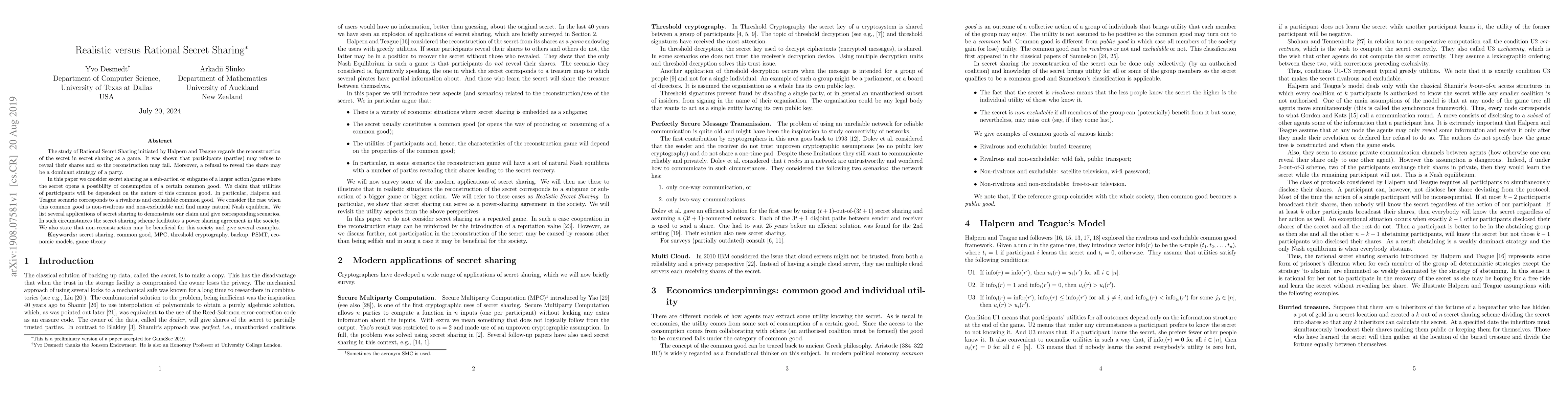 This paper contrasts Rational Secret Sharing, where participants may refuse to reveal their shares, with Realistic Secret Sharing involving a non-rivalrous and non-excludable common good, leading to many natural Nash equilibria and beneficial power-sharing agreements. It argues that non-reconstruction can sometimes be advantageous in such contexts.