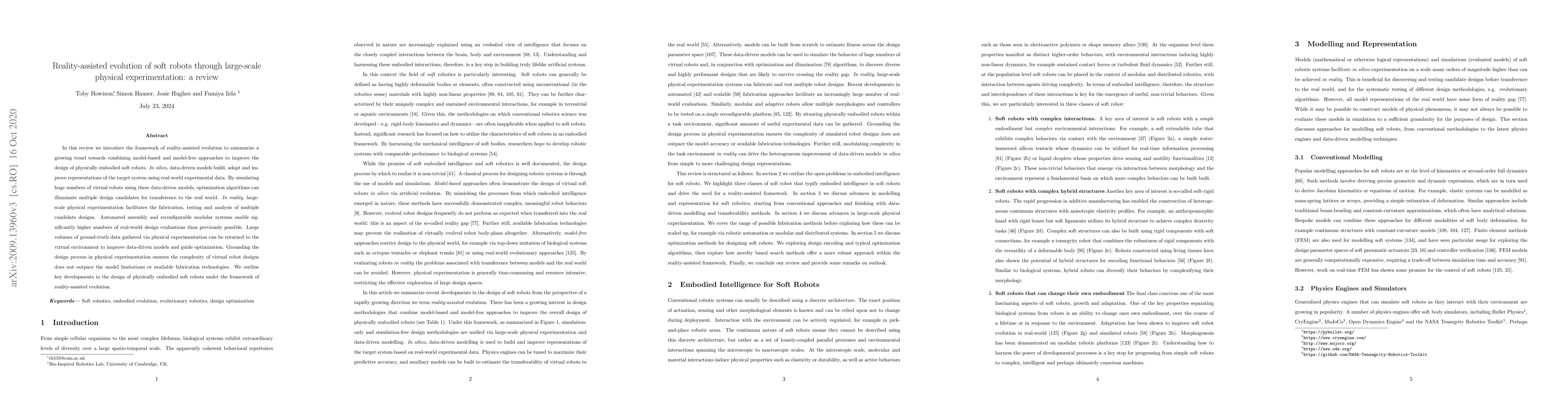 In this review we introduce the framework of reality-assisted evolution to summarize a growing trend towards combining model-based and model-free approaches to improve the design of physically embodied soft robots. In silico, data-driven models build, adapt and improve representations of the target system using real-world experimental data. By simulating huge numbers of virtual robots using these data-driven models, optimization algorithms can illuminate multiple design candidates for transference to the real world. In reality, large-scale physical experimentation facilitates the fabrication, testing and analysis of multiple candidate designs. Automated assembly and reconfigurable modular systems enable significantly higher numbers of real-world design evaluations than previously possible. Large volumes of ground-truth data gathered via physical experimentation can be returned to the virtual environment to improve data-driven models and guide optimization. Grounding the design process in physical experimentation ensures the complexity of virtual robot designs does not outpace the model limitations or available fabrication technologies. We outline key developments in the design of physically embodied soft robots under the framework of reality-assisted evolution.