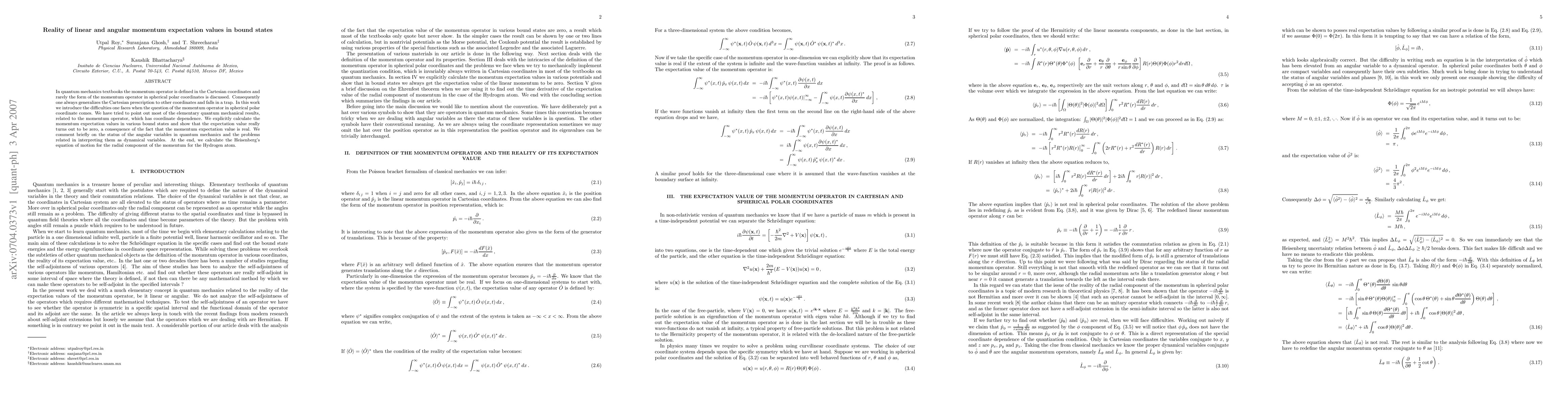This paper investigates the coordinate dependence of the momentum operator in quantum mechanics, particularly in spherical polar coordinates, and demonstrates that the momentum expectation values in bound states are zero. It also discusses the interpretation challenges of angular momentum and concludes with the calculation of the radial momentum's Heisenberg equation of motion for the hydrogen atom.