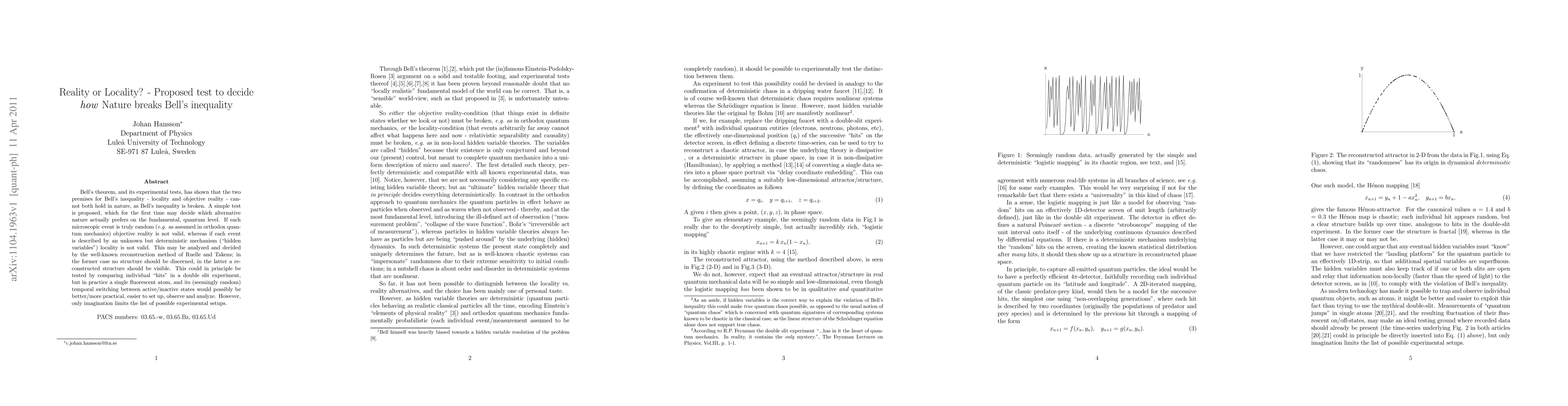 Bell's theorem, and its experimental tests, has shown that the two premises for Bell's inequality - locality and objective reality - cannot both hold in nature, as Bell's inequality is broken. A simple test is proposed, which for the first time may decide which alternative nature actually prefers on the fundamental, quantum level. If each microscopic event is truly random (e.g. as assumed in orthodox quantum mechanics) objective reality is not valid, whereas if each event is described by an unknown but deterministic mechanism ("hidden variables") locality is not valid. This may be analyzed and decided by the well-known reconstruction method of Ruelle and Takens; in the former case no structure should be discerned, in the latter a reconstructed structure should be visible. This could in principle be tested by comparing individual "hits" in a double slit experiment, but in practice a single fluorescent atom, and its (seemingly random) temporal switching between active/inactive states would possibly be better/more practical, easier to set up, observe and analyze. However, only imagination limits the list of possible experimental setups.
