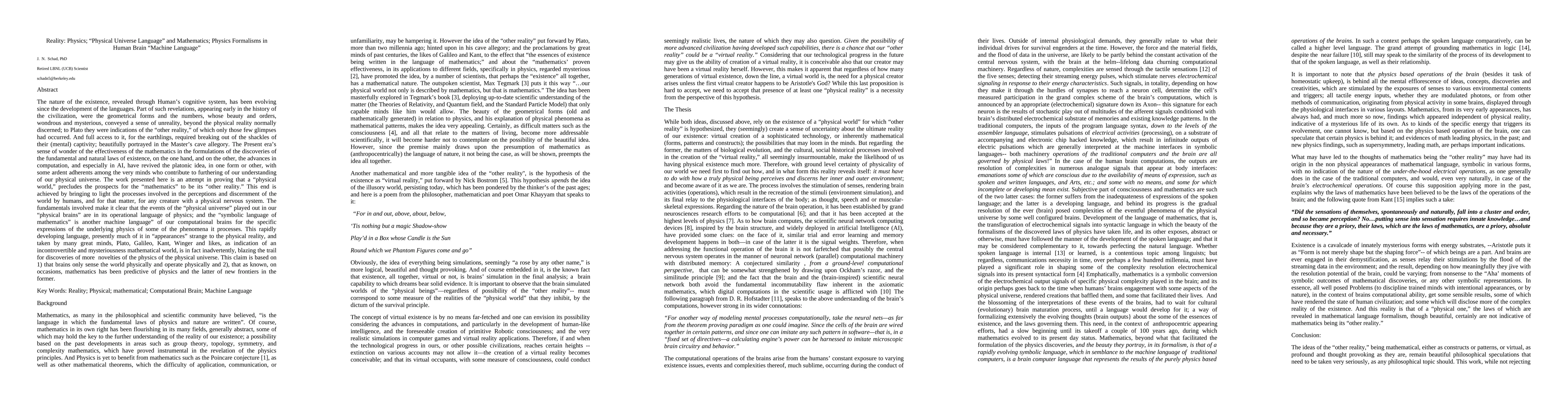 The nature of the existence, revealed through Human cognitive system, has been evolving since the development of the languages. Part of such revelations were the geometrical forms and the numbers, whose beauty and order, wondrous and mysterious, conveyed a sense of unreality beyond the physical reality normally discerned; to Plato they were indications of the other reality of which only those few glimpses had occurred. And full access for the earthlings required breaking out of their shackles of captivity; beautifully portrayed in the Masters cave allegory. The Present era sense of wonder of the effectiveness of the mathematics in the formulations of the discoveries of the fundamental and natural laws of existence, and the advances in computation, and especially in artificial intelligence (AI), have revived the platonic idea with some adherents among the very minds who contribute to furthering of our understanding of our physical universe. The work presented here is an attempt in proving that a physical world precludes the prospects for the mathematics to be its other reality. This end is achieved by bringing to light the processes involved in the discernment of the world by humans. The fundamentals involved make it clear that the events of the physical universe, are played out in our physical brains operational language of physics; and the symbolic language of mathematics is another machine language of our computational brains for the specific expressions of the underlying physics of some of the phenomena it processes. This rapidly developing language, presently much in appearances strange to the physical reality, and taken by many great minds; Plato, Galileo, Kant, Winger and the likes, as indication of an incontrovertible and mysteriousness mathematical world, is in fact inadvertently, blazing the trail for discoveries of more novelties of the physics of the physical universe.