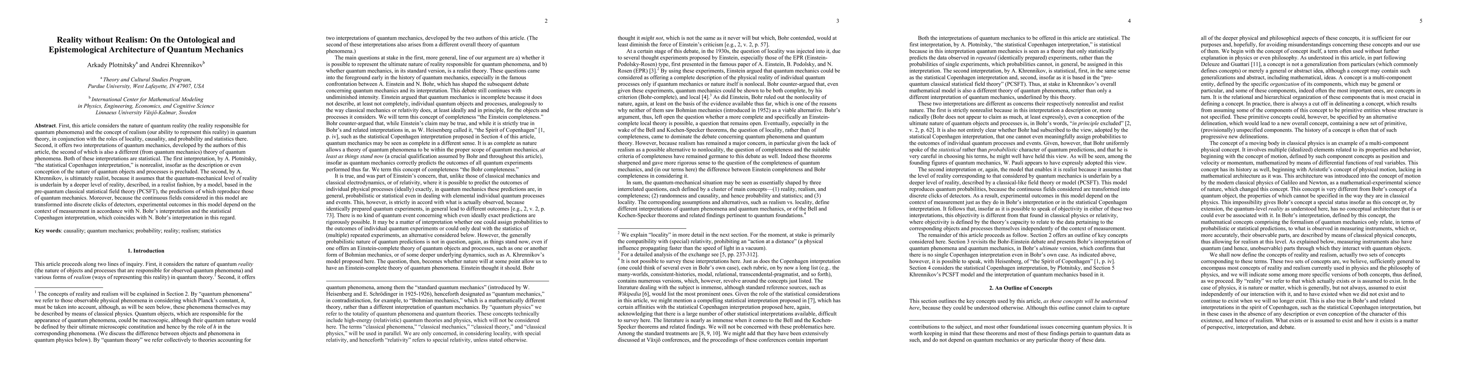 First, this article considers the nature of quantum reality (the reality responsible for quantum phenomena) and the concept of realism (our ability to represent this reality) in quantum theory, in conjunction with the roles of locality, causality, and probability and statistics there. Second, it offers two interpretations of quantum mechanics, developed by the authors of this article, the second of which is also a different (from quantum mechanics) theory of quantum phenomena. Both of these interpretations are statistical. The first interpretation, by A. Plotnitsky, "the statistical Copenhagen interpretation," is nonrealist, insofar as the description or even conception of the nature of quantum objects and processes is precluded. The second, by A. Khrennikov, is ultimately realist, because it assumes that the quantum-mechanical level of reality is underlain by a deeper level of reality, described, in a realist fashion, by a model, based on the pre-quantum classical statistical field theory (PCSFT), the predictions of which reproduce those of quantum mechanics. Moreover, because the continuous fields considered in this model are transformed into discrete clicks of detectors, experimental outcomes in this model depend on the context of measurement in accordance with N. Bohr's interpretation and the statistical Copenhagen interpretation, which coincides with Bohr's interpretation in this regard.