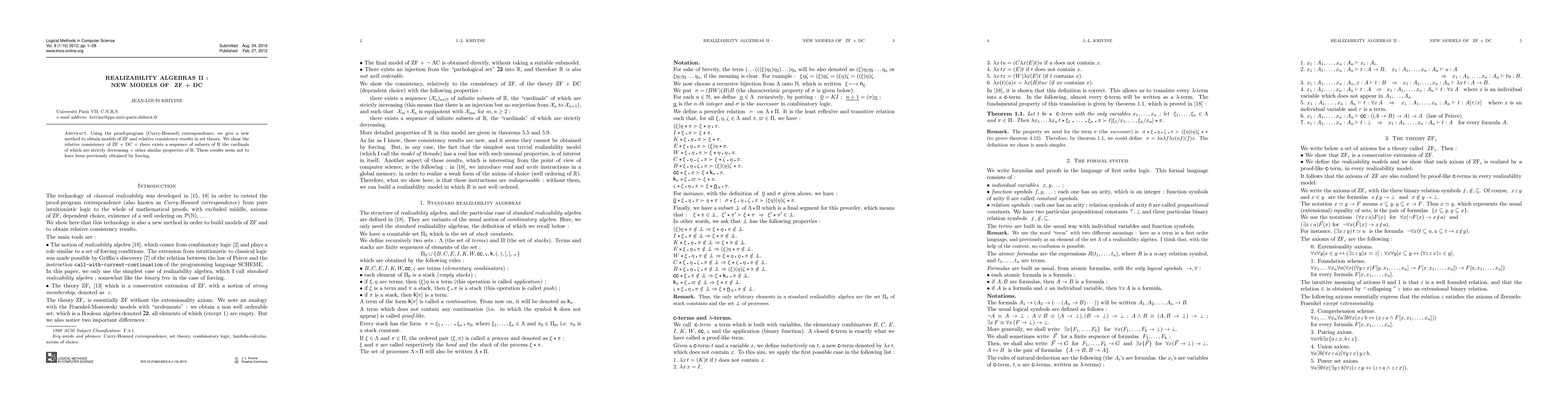 Using the proof-program (Curry-Howard) correspondence, we give a new method to obtain models of ZF and relative consistency results in set theory. We show the relative consistency of ZF + DC + there exists a sequence of subsets of R the cardinals of which are strictly decreasing + other similar properties of R. These results seem not to have been previously obtained by forcing.