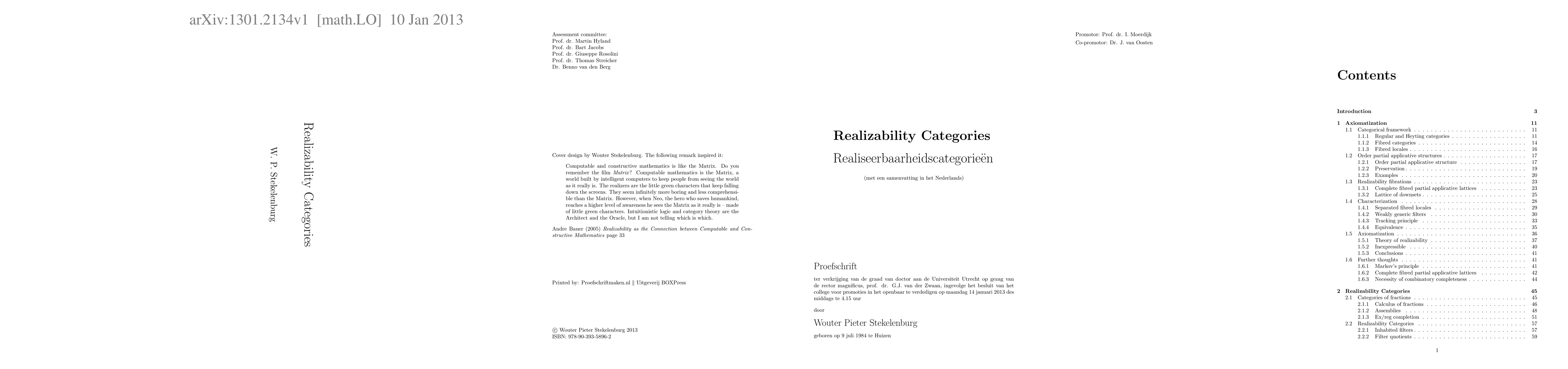 This is the author's Ph.D. Thesis. It contains results from four years of research into realizability and categorical logic. The main subjects are the axiomatisation of realizable propositions, and a characterization of realizability categories as pseudoinitial objects. Realizability is a collection of techniques in the study of constructive logic. Some forms of realizability induce realizability categories, which are Heyting categories and therefore have a first order intuitionistic logic as internal language. The axiomatisation chapter of the thesis explains how and to what extend we can axiomatise the set of valid propositions in this internal language. The realizability categories chapter explains how to find regular functors from realizability categories into other categories.