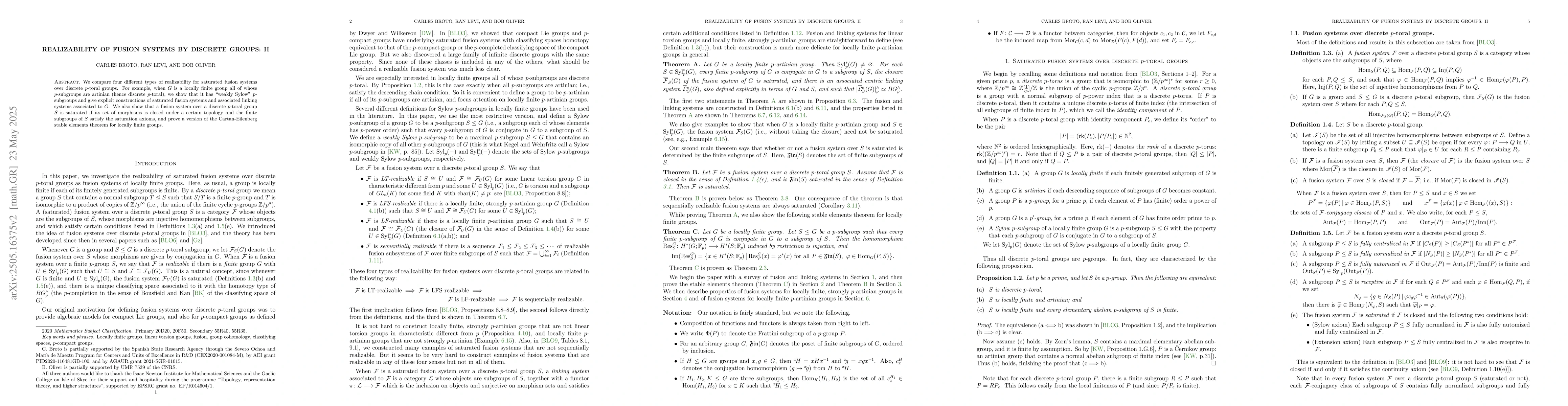 The main technical contribution lies in the detailed comparison of realizability types for saturated fusion systems over discrete p-toral groups, along with explicit constructions of fusion and linking systems, and a novel approach to proving saturation conditions and a stable elements theorem.