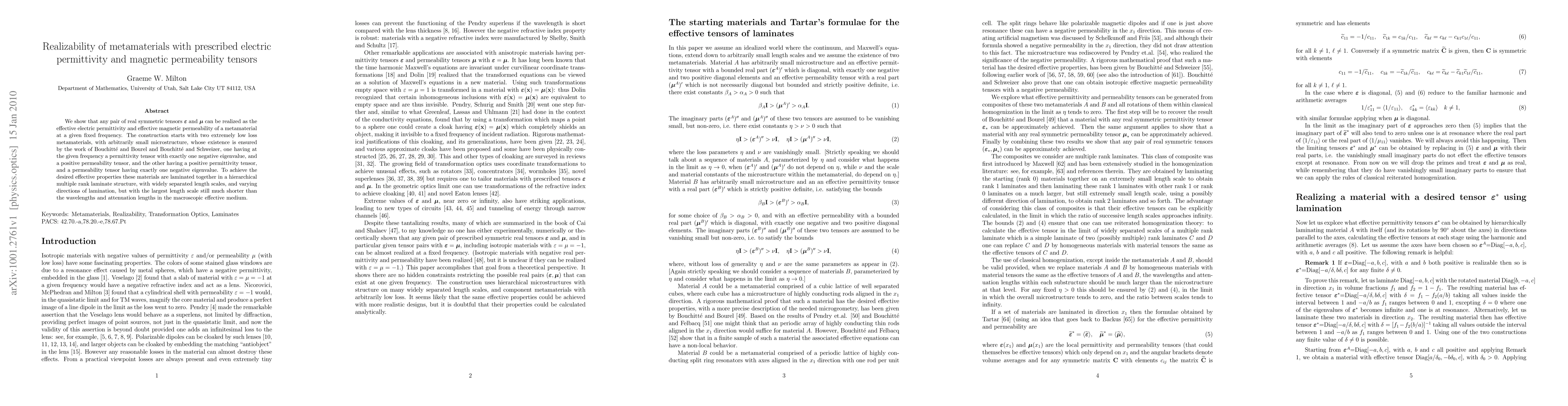 This paper demonstrates the feasibility of designing metamaterials with any specified real symmetric tensors for electric permittivity and magnetic permeability at a fixed frequency. It constructs these materials by layering two low-loss metamaterials with specific tensor properties, achieving the desired effective properties through a hierarchical laminate structure.