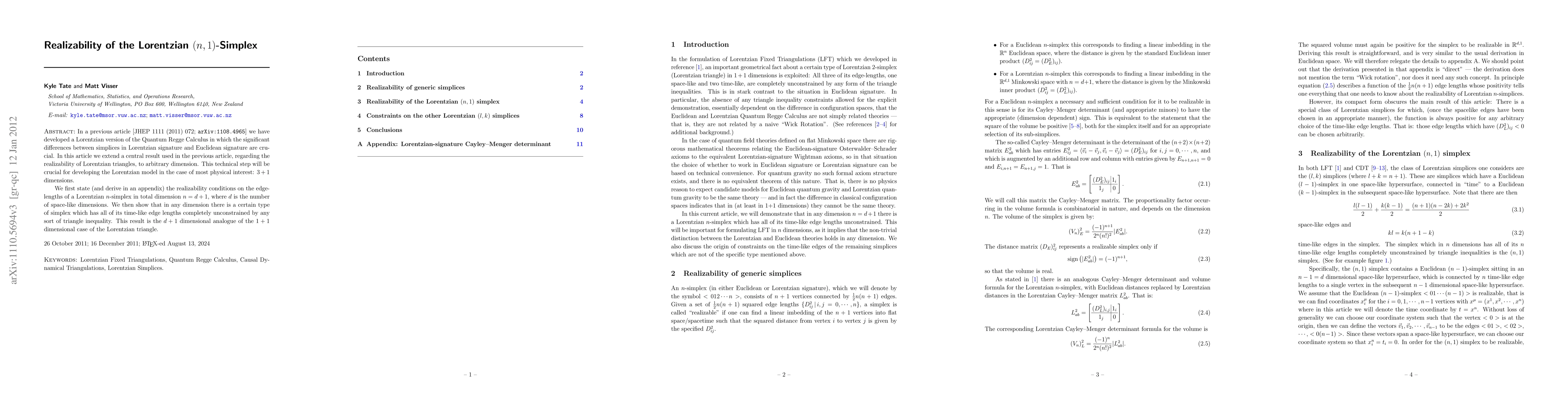 In a previous article [JHEP 1111 (2011) 072; arXiv:1108.4965] we have developed a Lorentzian version of the Quantum Regge Calculus in which the significant differences between simplices in Lorentzian signature and Euclidean signature are crucial. In this article we extend a central result used in the previous article, regarding the realizability of Lorentzian triangles, to arbitrary dimension. This technical step will be crucial for developing the Lorentzian model in the case of most physical interest: 3+1 dimensions. We first state (and derive in an appendix) the realizability conditions on the edge-lengths of a Lorentzian n-simplex in total dimension n=d+1, where d is the number of space-like dimensions. We then show that in any dimension there is a certain type of simplex which has all of its time-like edge lengths completely unconstrained by any sort of triangle inequality. This result is the d+1 dimensional analogue of the 1+1 dimensional case of the Lorentzian triangle.