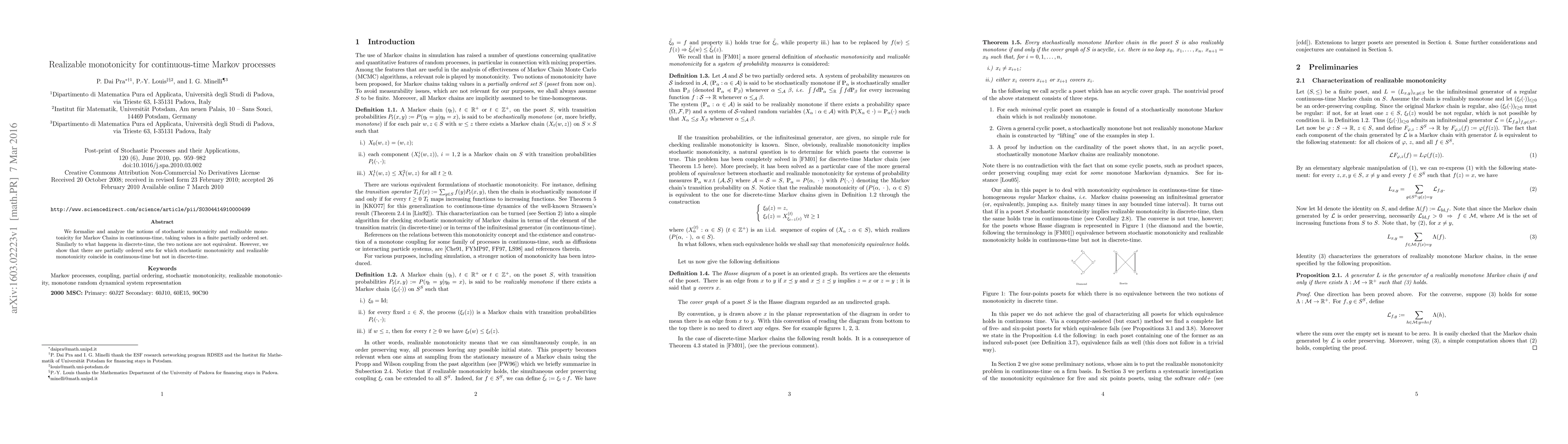 This paper formalizes the concepts of stochastic and realizable monotonicity for continuous-time Markov processes defined on finite partially ordered sets. It reveals that while these notions differ, they coincide for certain partially ordered sets in continuous-time, contrasting with their behavior in discrete-time.
