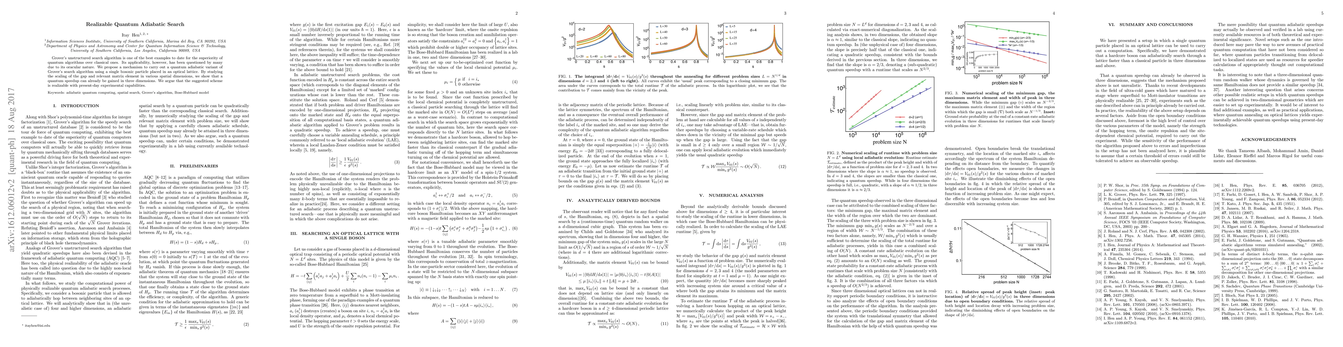This paper proposes a quantum adiabatic variant of Grover's search algorithm using a single bosonic particle in an optical lattice, demonstrating quantum speedup in three dimensions. The authors argue that the suggested scheme is feasible with current experimental technology.
