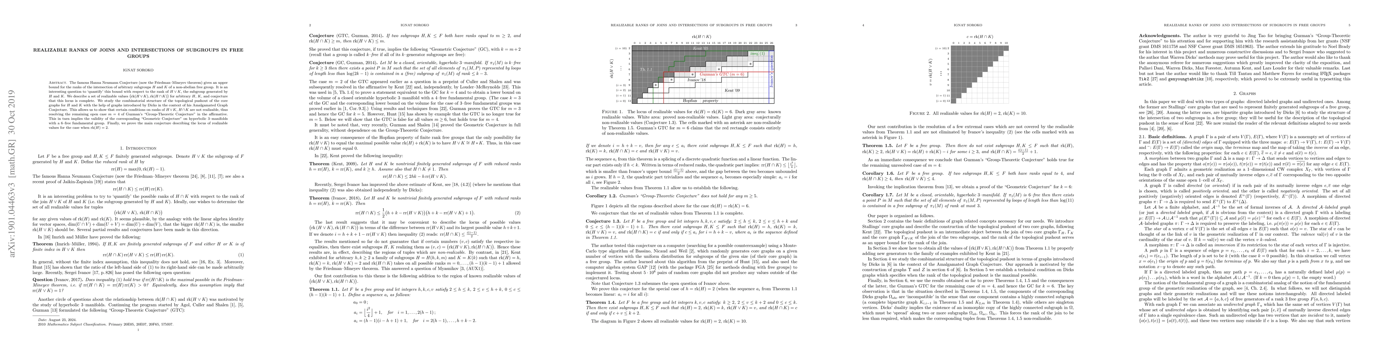 The famous Hanna Neumann Conjecture (now the Friedman-Mineyev theorem) gives an upper bound for the ranks of the intersection of arbitrary subgroups $H$ and $K$ of a non-abelian free group. It is an interesting question to `quantify' this bound with respect to the rank of $H\vee K$, the subgroup generated by $H$ and $K$. We describe a set of realizable values $(rk(H\vee K),rk(H\cap K))$ for arbitrary $H$, $K$, and conjecture that this locus is complete. We study the combinatorial structure of the topological pushout of the core graphs for $H$ and $K$, with the help of graphs introduced by Dicks in the context of his Amalgamated Graph Conjecture. This allows us to show that certain conditions on ranks of $H\vee K$, $H\cap K$ are not realizable, thus resolving the remaining open case $m=4$ of Guzman's "Group-Theoretic Conjecture" in the affirmative. This in turn implies the validity of the corresponding "Geometric Conjecture" on hyperbolic $3$-manifolds with a $6$-free fundamental group. Finally, we prove the main conjecture describing the locus of realizable values for the case when $rk(H)=2$.