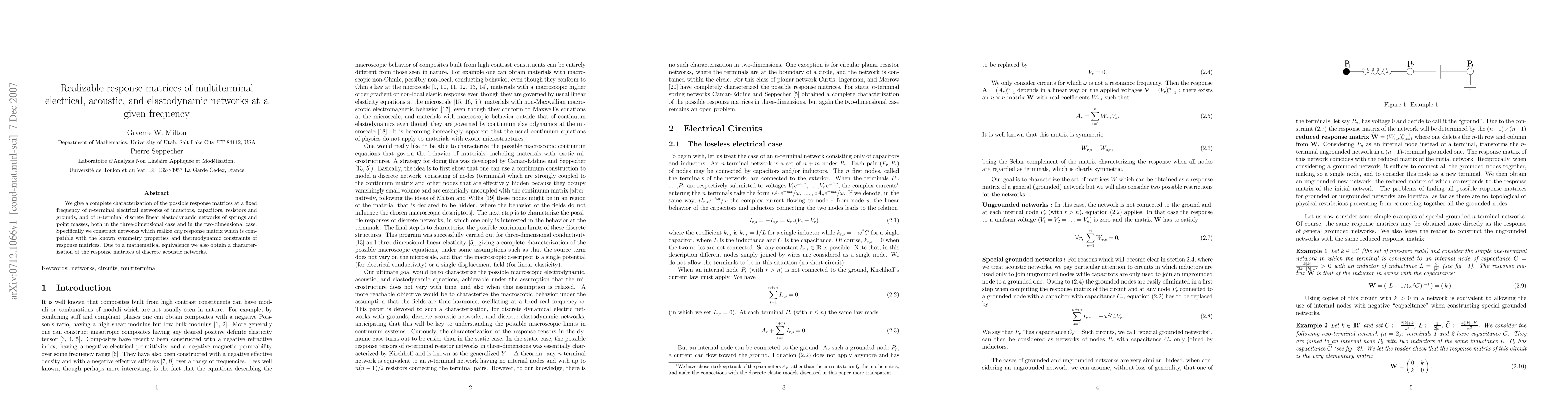 This paper provides a comprehensive characterization of response matrices for n-terminal electrical, elastodynamic, and acoustic networks at a fixed frequency, constructing networks that realize any compatible response matrix. The study also reveals a mathematical equivalence that extends the findings to discrete acoustic networks.