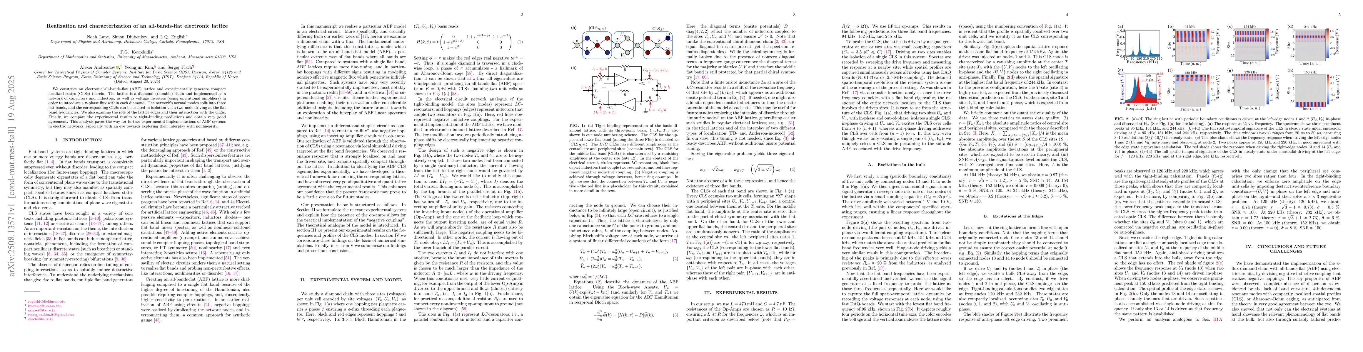We construct an electronic all-bands-flat (ABF) lattice and experimentally generate compact localized states (CLSs) therein. The lattice is a diamond (rhombic) chain and implemented as a network of capacitors and inductors, as well as voltage inverters (using operational amplifiers) in order to introduce a \(\pi\)-phase flux within each diamond. The network's normal modes split into three flat bands, and the corresponding CLSs can be excited in isolation via a two-node driving at the flat band frequencies. We also examine the role of the lattice edges and their interaction with the CLSs. Finally, we compare the experimental results to tight-binding predictions and obtain very good agreement. This analysis paves the way for further experimental implementations of ABF systems in electric networks, especially with an eye towards exploring their interplay with nonlinearity.