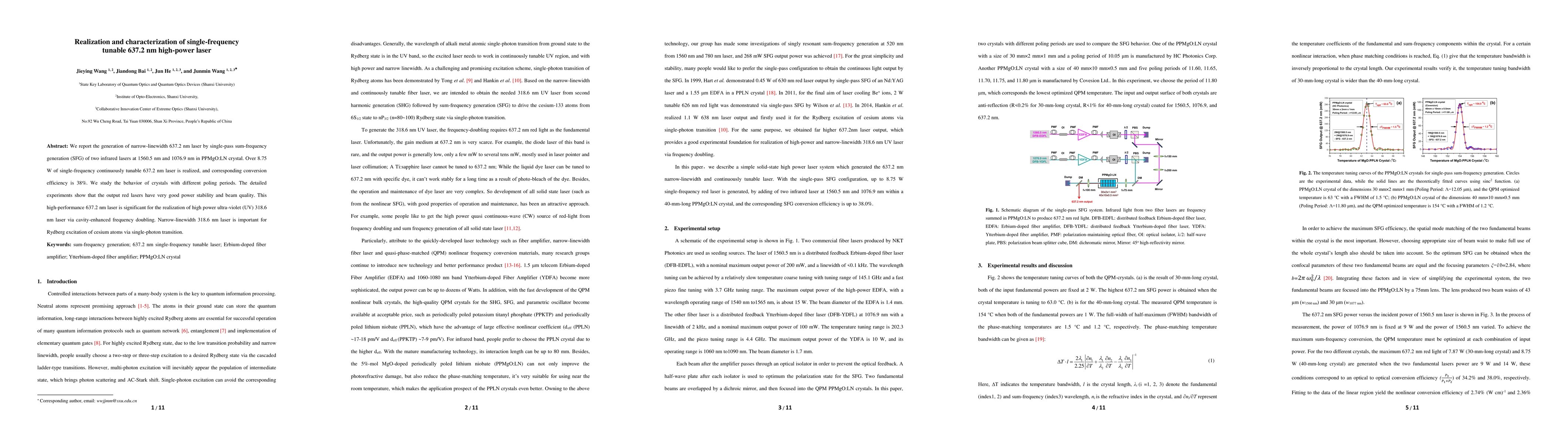 This paper reports the generation of a narrow-linewidth, high-power tunable 637.2 nm laser through single-pass sum-frequency generation, achieving over 8.75 W with a 38% conversion efficiency. The study also highlights the stability and quality of the laser output, with potential applications in high-power ultraviolet laser generation and Rydberg excitation of cesium atoms.