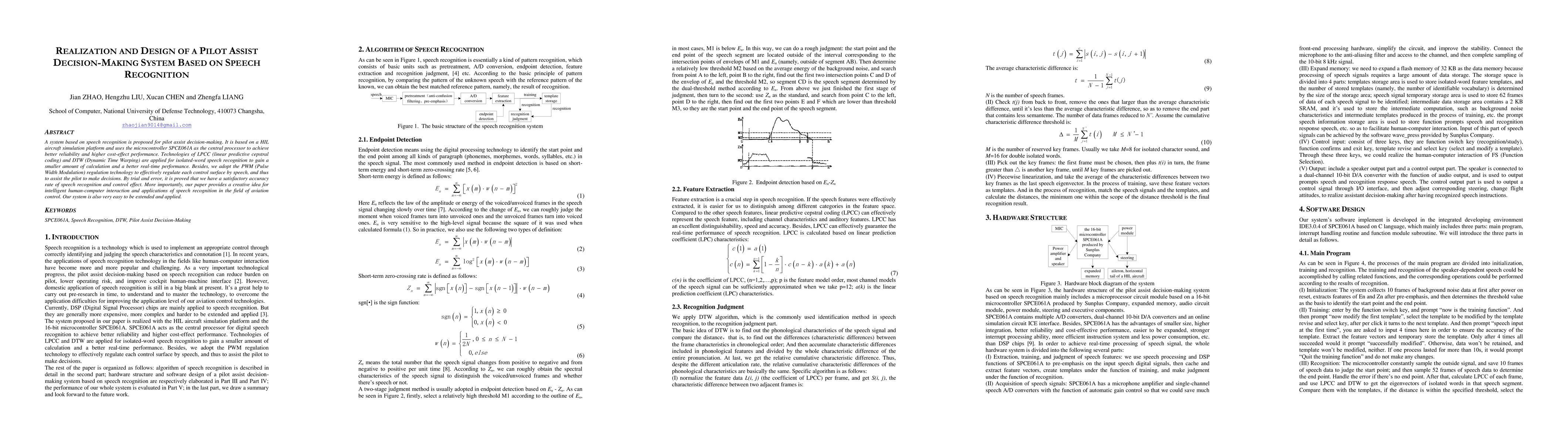 This paper proposes a speech recognition-based pilot assist decision-making system using a HIL simulation platform and SPCE061A microcontroller. It employs LPCC and DTW for efficient isolated-word recognition and PWM for control surface regulation, achieving satisfactory accuracy and real-time performance.