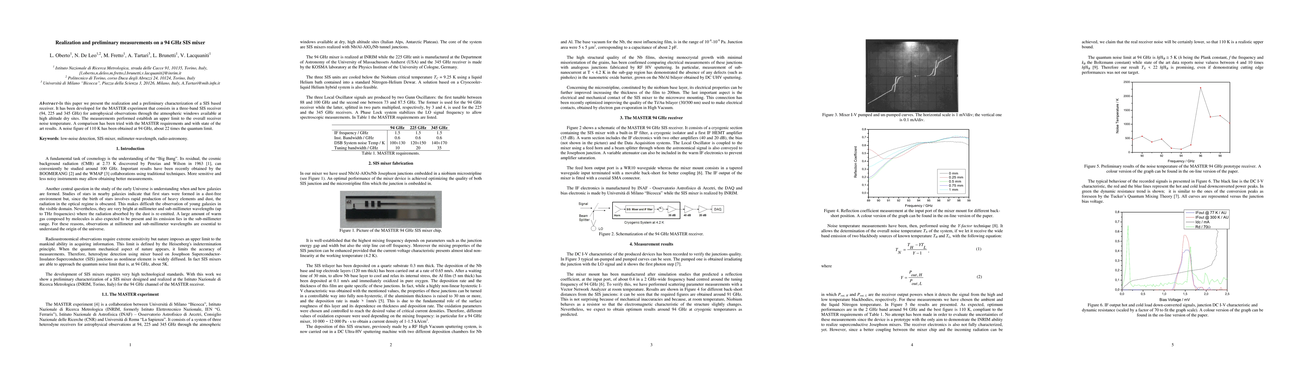 In this paper we present the realization and a preliminary characterization of a SIS based receiver. It has been developed for the MASTER experiment that consists in a three-band SIS receiver (94, 225 and 345 GHz) for astrophysical observations through the atmospheric windows available at high altitude dry sites. The measurements performed establish an upper limit to the overall receiver noise temperature. A comparison has been tried with the MASTER requirements and with state of the art results. A noise figure of 110 K has been obtained at 94 GHz, about 22 times the quantum limit.
