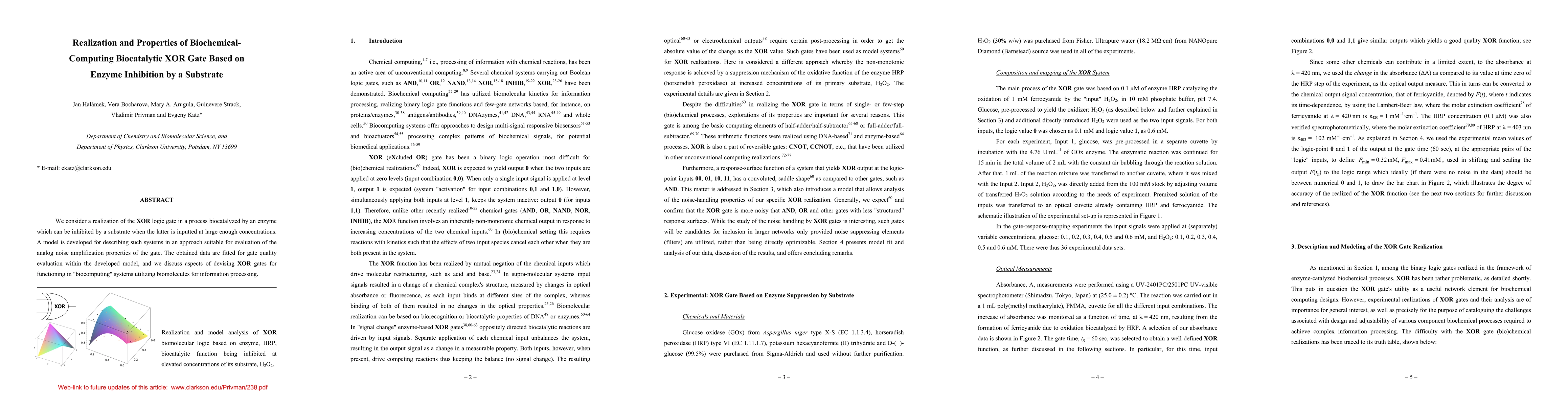 This paper presents a biochemical-computing XOR gate realized through enzyme inhibition by substrate, specifically using horseradish peroxidase, and evaluates its analog noise amplification properties. The study discusses potential applications in biocomputing systems that leverage biomolecules for information processing.