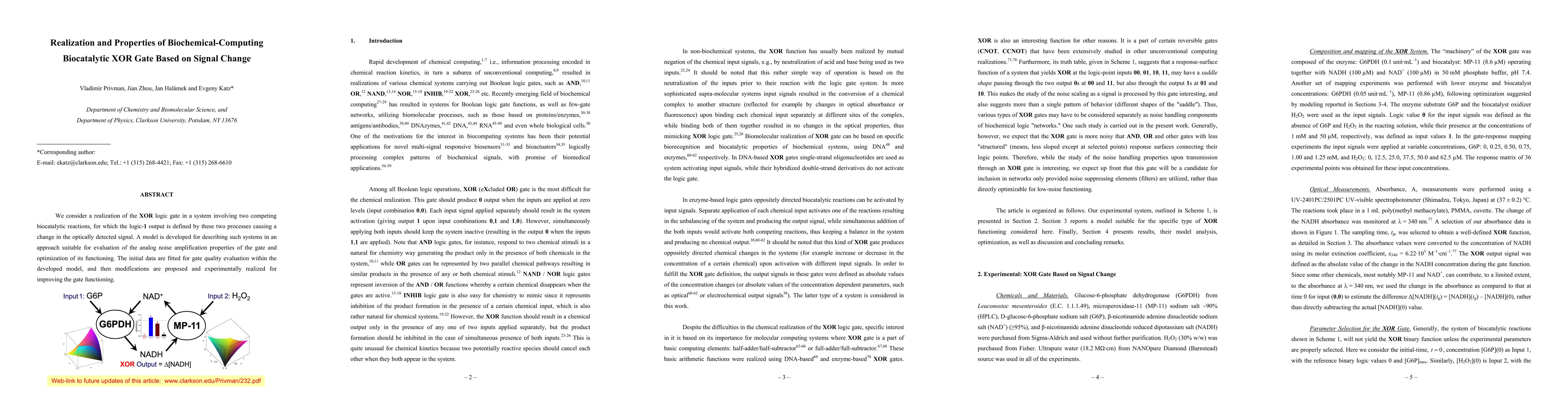 This paper presents a biochemical-computing XOR gate realized through two competing biocatalytic reactions that alter an optically detected signal, modeling its analog noise amplification and optimizing its performance through experimental modifications. Initial data fitting informs gate quality evaluation, leading to proposed improvements.