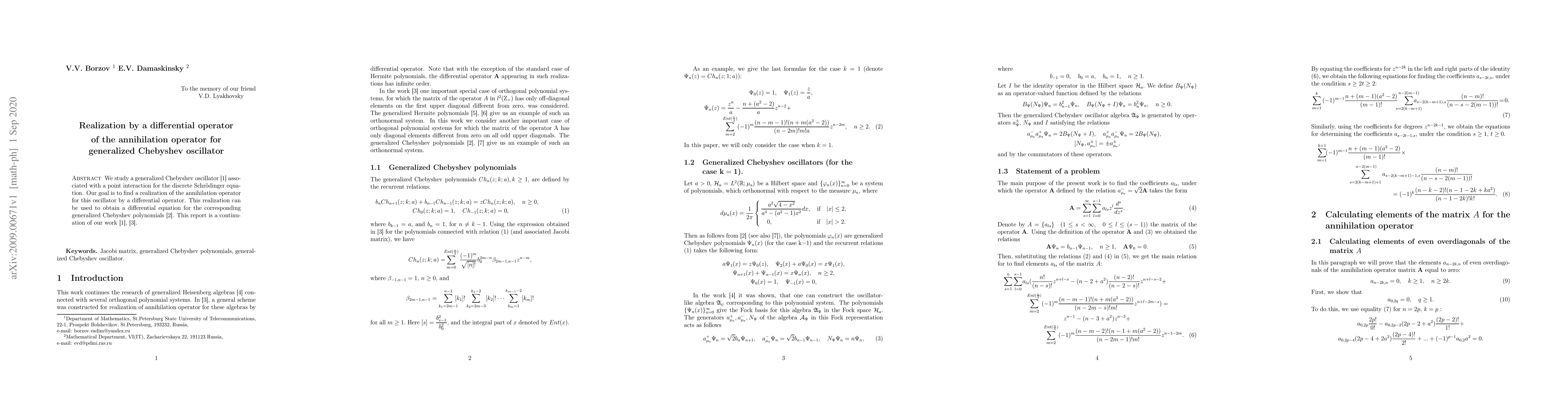 We study a generalized Chebyshev oscillator [1] associated with a point interaction for the discrete Schr\"odinger equation. Our goal is to find a realization of the annihilation operator for this oscillator by a differential operator. This realization can be used to obtain a differential equation for the corresponding generalized Chebyshev polynomials [2]. This report is a continuation of our work [1], [3].