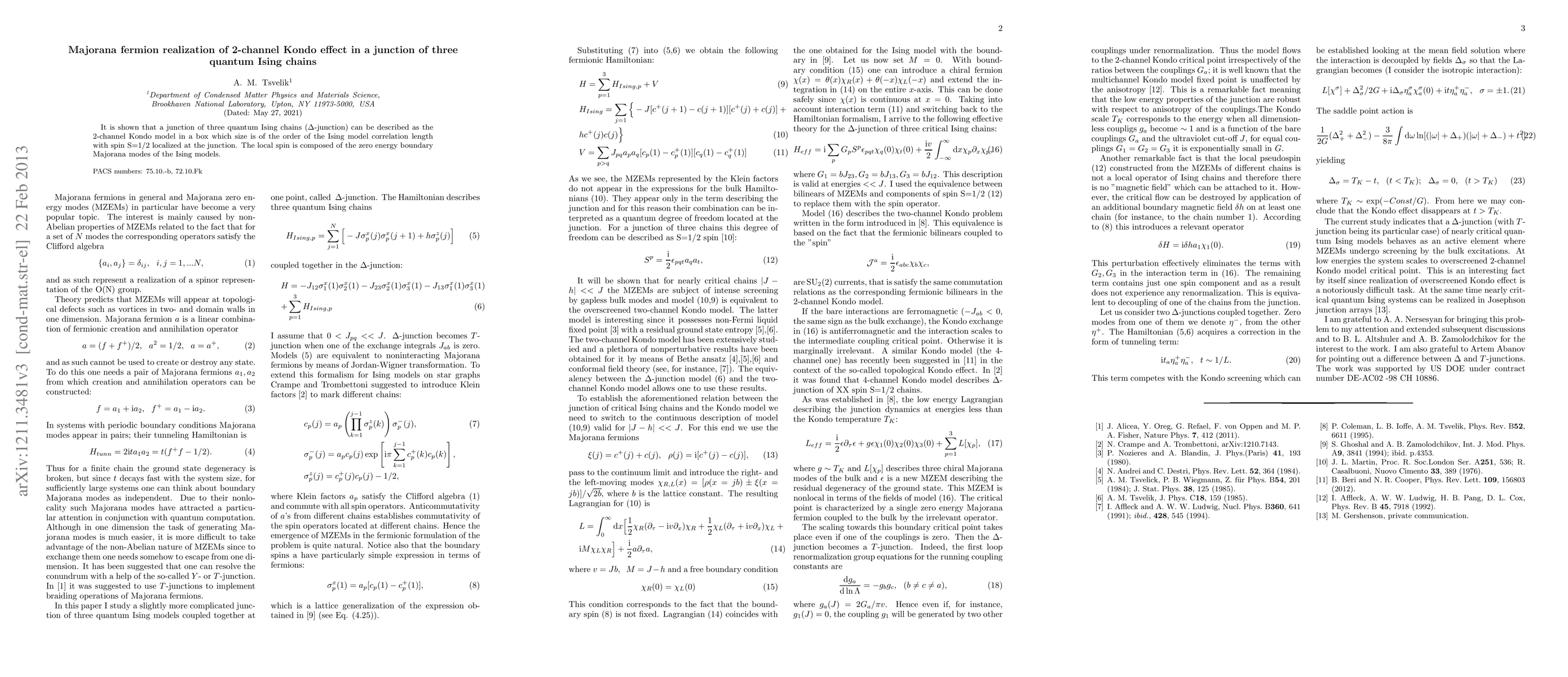 Summary: A junction of three quantum Ising chains exhibits a 2-channel Kondo effect, where the junction's local spin, formed by zero-energy boundary Majorana modes, behaves as a spin S=1/2 interacting with the conduction electrons in the system. This realization mimics the 2-channel Kondo model within a region comparable to the Ising model's correlation length.