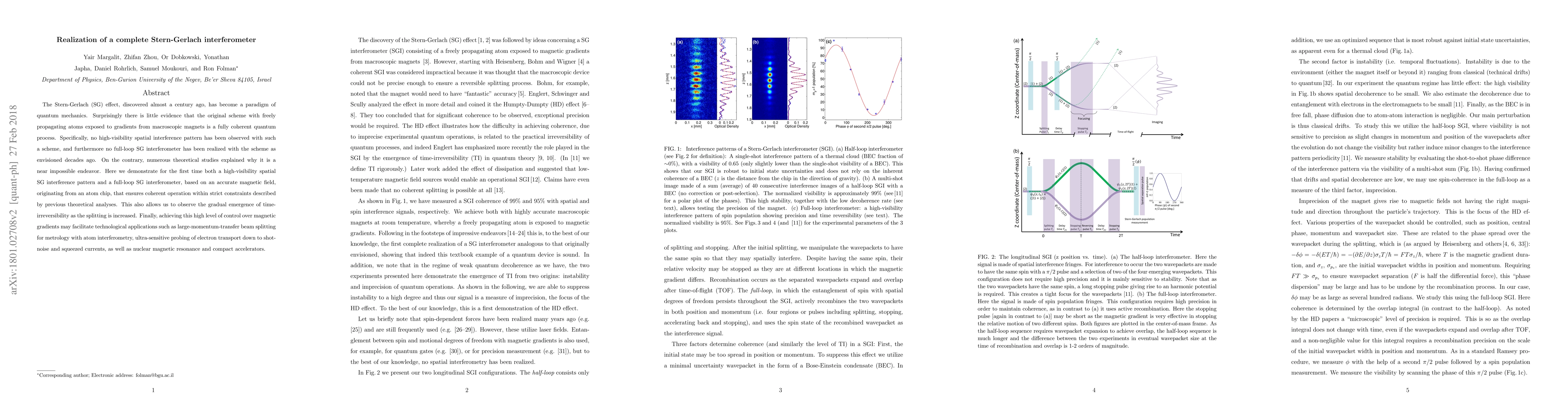 This paper demonstrates the first realization of a complete Stern-Gerlach interferometer with high-visibility spatial interference, overcoming previous theoretical challenges. The achievement is based on precise magnetic fields from an atom chip, enabling potential applications in metrology, electron transport probing, and nuclear magnetic resonance.