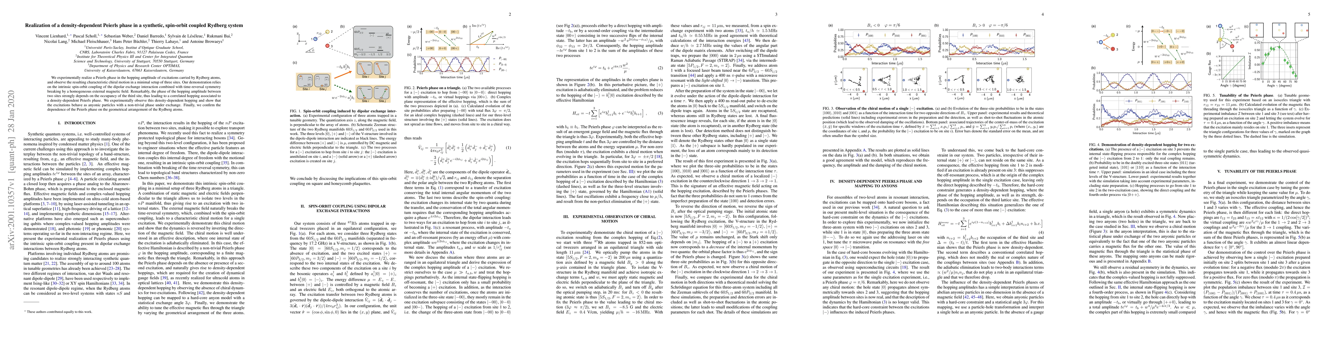 We experimentally realize a Peierls phase in the hopping amplitude of excitations carried by Rydberg atoms, and observe the resulting characteristic chiral motion in a minimal setup of three sites. Our demonstration relies on the intrinsic spin-orbit coupling of the dipolar exchange interaction combined with time-reversal symmetry breaking by a homogeneous external magnetic field. Remarkably, the phase of the hopping amplitude between two sites strongly depends on the occupancy of the third site, thus leading to a correlated hopping associated to a density-dependent Peierls phase. We experimentally observe this density-dependent hopping and show that the excitations behave as anyonic particles with a non-trivial phase under exchange. Finally, we confirm the dependence of the Peierls phase on the geometrical arrangement of the Rydberg atoms.