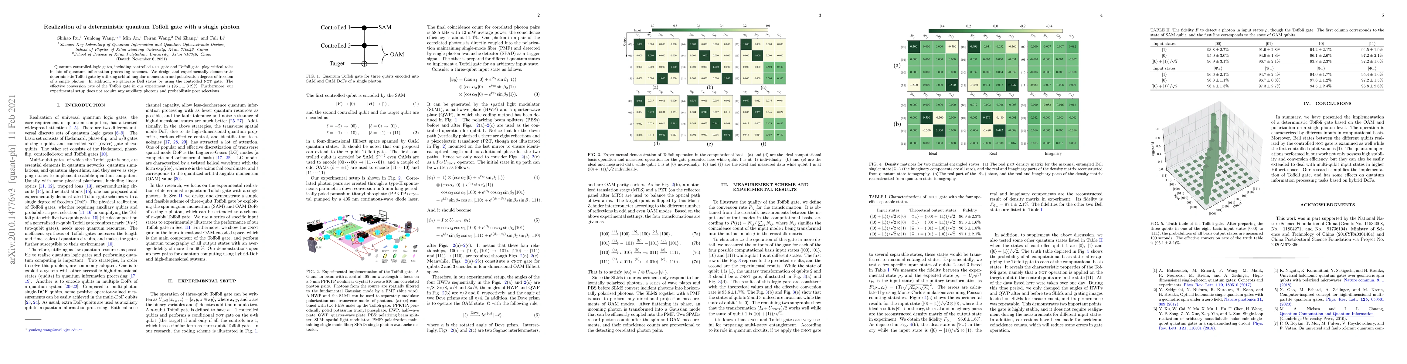 This paper demonstrates a deterministic quantum Toffoli gate using a single photon's orbital-angular-momentum and polarization states, achieving a conversion rate of $(95.1\pm3.2)\%$ without auxiliary photons or probabilistic post selections. Additionally, it generates Bell states using a controlled NOT gate.
