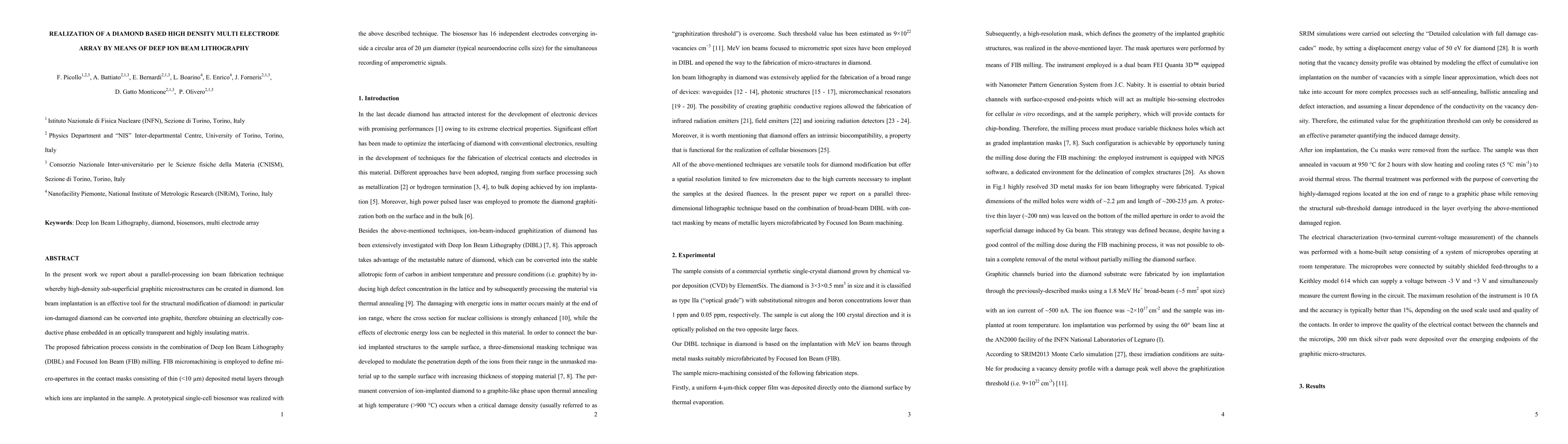 This paper describes a novel ion beam fabrication technique using Deep Ion Beam Lithography and Focused Ion Beam milling to create high-density, sub-superficial graphitic microstructures in diamond for a multi-electrode biosensor. The biosensor features 16 independent electrodes for simultaneous amperometric signal recording.