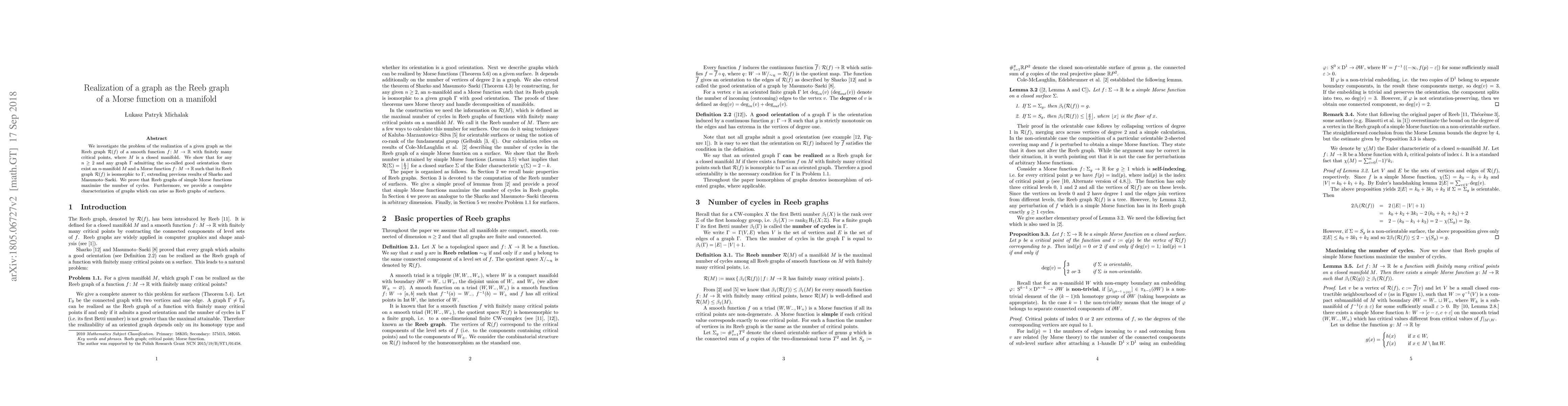 This paper explores the realization of a given graph as the Reeb graph of a Morse function on a manifold, demonstrating that any graph with a good orientation can be realized as such a Reeb graph for an n-manifold, extending prior results. It also characterizes graphs that can arise as Reeb graphs of surfaces and shows that Reeb graphs of simple Morse functions maximize the number of cycles.