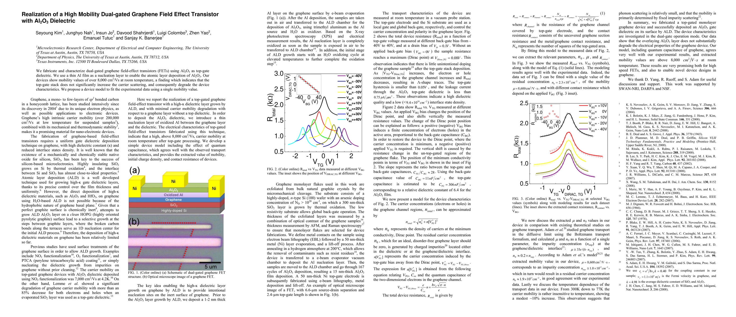 The paper details the fabrication and high-performance characterization of dual-gated graphene FETs utilizing Al2O3 as a dielectric, achieving mobility over 8,000 cm2/Vs at room temperature, and presents a device model to explain the experimental results.