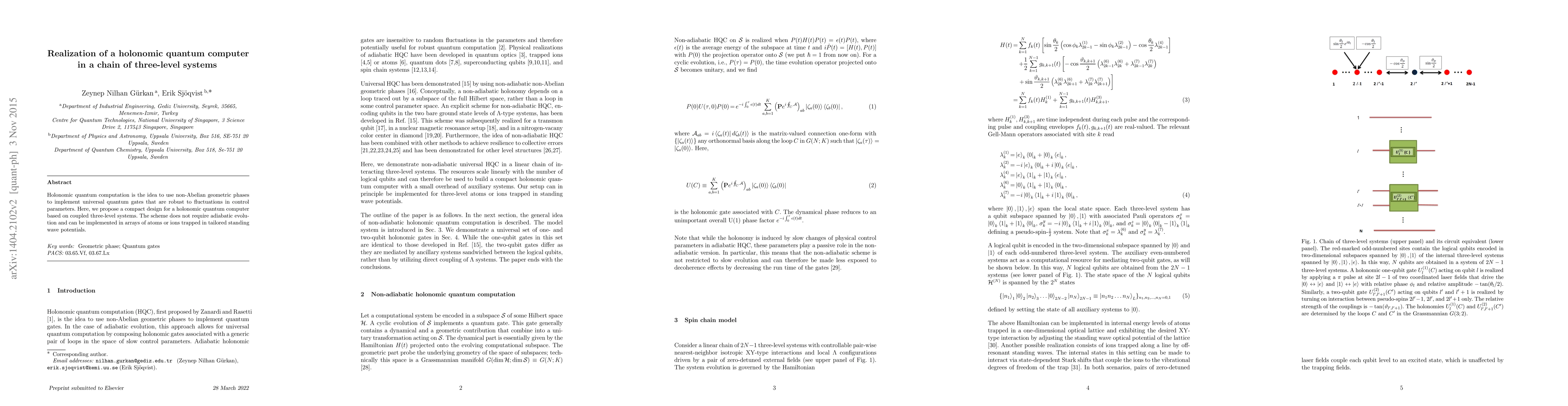 A universal, explicitly scalable scheme for quantum computation based on non-Abelian holonomies realized by interacting three-level systems.