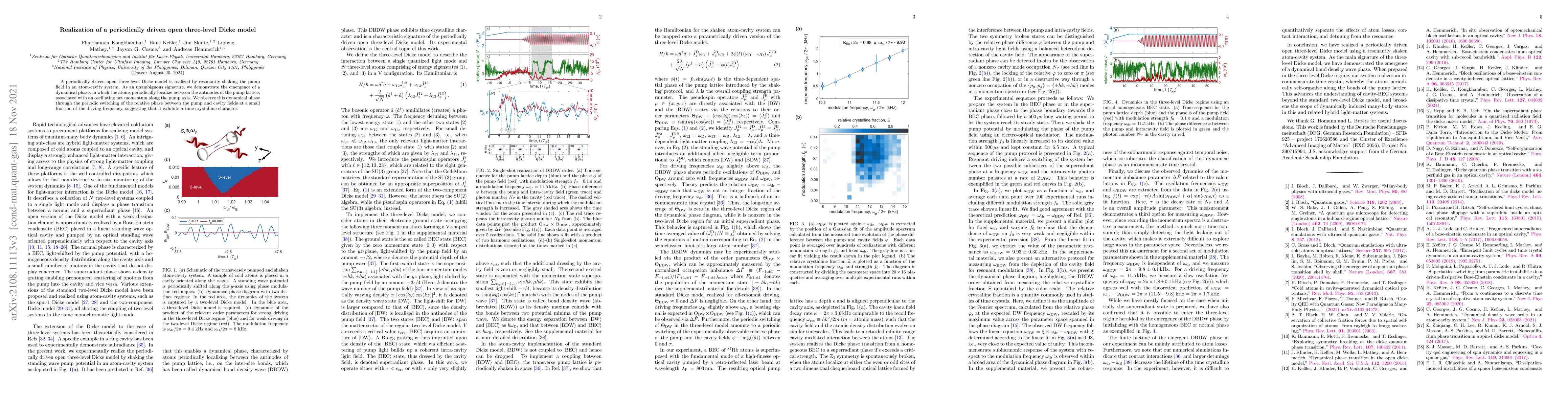The research realizes a periodically driven open three-level Dicke model by shaking the pump field in an atom-cavity system, demonstrating a dynamical phase with atoms localizing between pump lattice antinodes and exhibiting time crystalline behavior via oscillating net momentum. This phase is identified by the periodic switching of the relative phase between the pump and cavity fields.