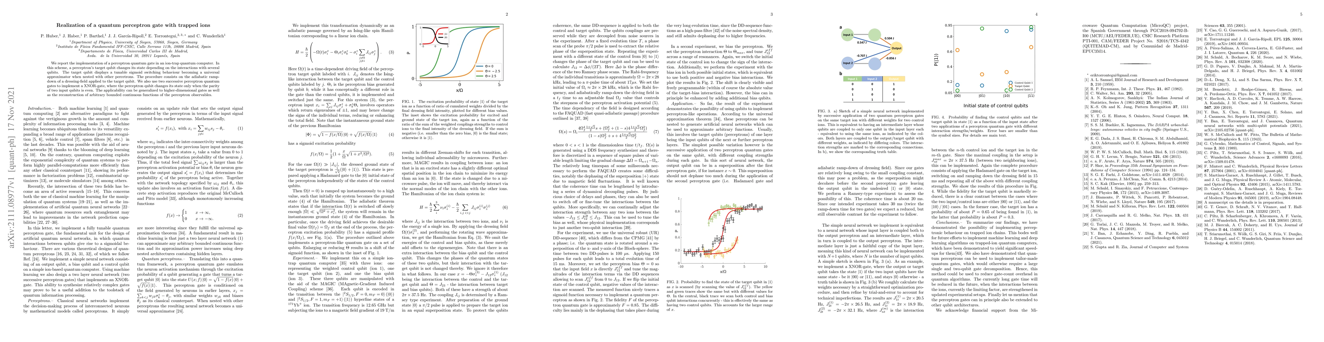 This paper details the implementation of a quantum perceptron gate using trapped ions in an ion-trap quantum computer, demonstrating its tunable sigmoid behavior and universal approximation capabilities. The authors also show the use of nested perceptron gates to create a XNOR-gate and discuss the potential for higher-dimensional gates and function reconstruction.