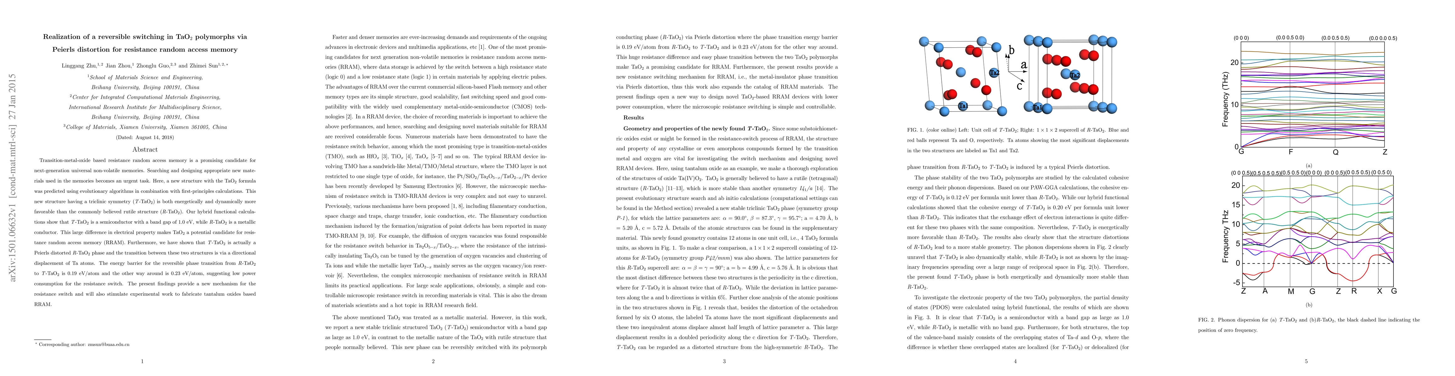 This paper proposes a new TaO2 polymorph (T-TaO2) with triclinic symmetry as a potential material for resistance random access memory (RRAM), showing it is a semiconductor with a band gap of 1.0 eV, contrasting with the metallic rutile structure (R-TaO2). The reversible switching between these phases via Peierls distortion and low energy barriers suggests low power consumption for resistance switching.