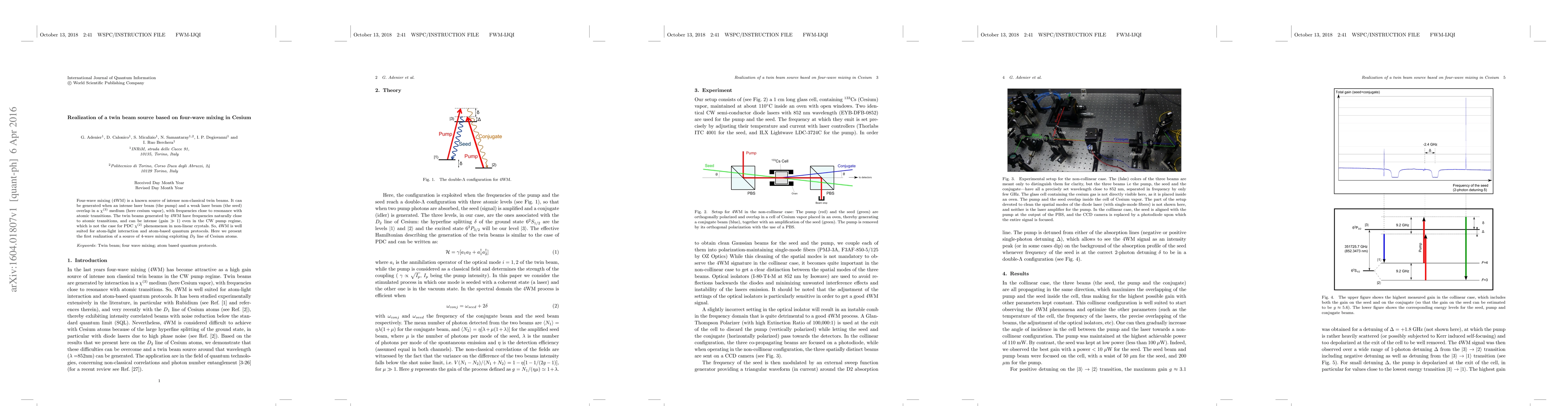 Four-wave mixing (4WM) is a known source of intense non-classical twin beams. It can be generated when an intense laser beam (the pump) and a weak laser beam (the seed) overlap in a $\chi^{(3)}$ medium (here cesium vapor), with frequencies close to resonance with atomic transitions. The twin beams generated by 4WM have frequencies naturally close to atomic transitions, and can be intense (gain $\gg 1$) even in the CW pump regime, which is not the case for PDC $\chi^{(2)}$ phenomenon in non-linear crystals. So, 4WM is well suited for atom-light interaction and atom-based quantum protocols. Here we present the first realization of a source of 4-wave mixing exploiting $D_2$ line of Cesium atoms.
