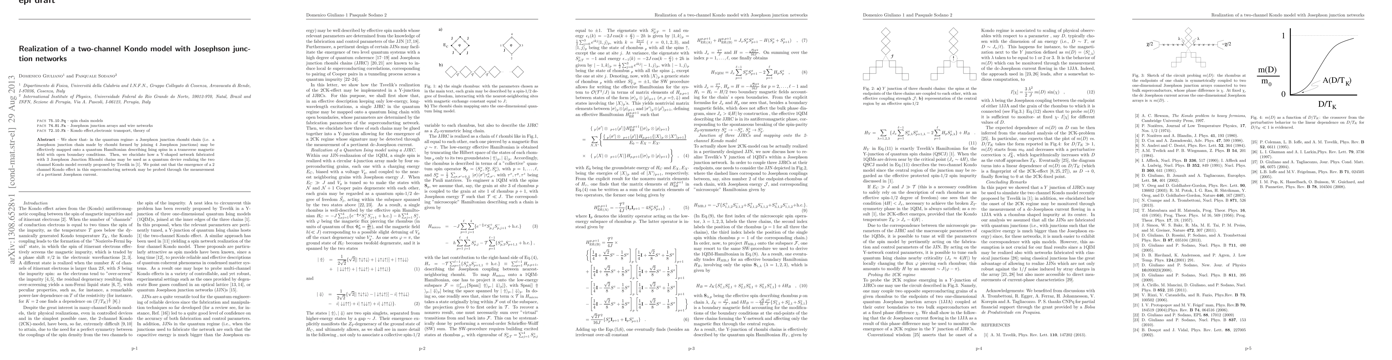 We show that- in the quantum regime- a Josephson junction rhombi chain (i.e. a Josephson junction chain made by rhombi formed by joining 4 Josephson junctions) may be effectively mapped onto a quantum Hamiltonian describing Ising spins in a transverse magnetic field with open boundary conditions. Then, we elucidate how a Y-shaped network fabricated with 3 Josephson Junction Rhombi chains may be used as a quantum device realizing the two channel Kondo model recently proposed by Tsvelik. We point out that the emergence of a 2 channel Kondo effect in this superconducting network may be probed through the measurement of a pertinent Josephson current.