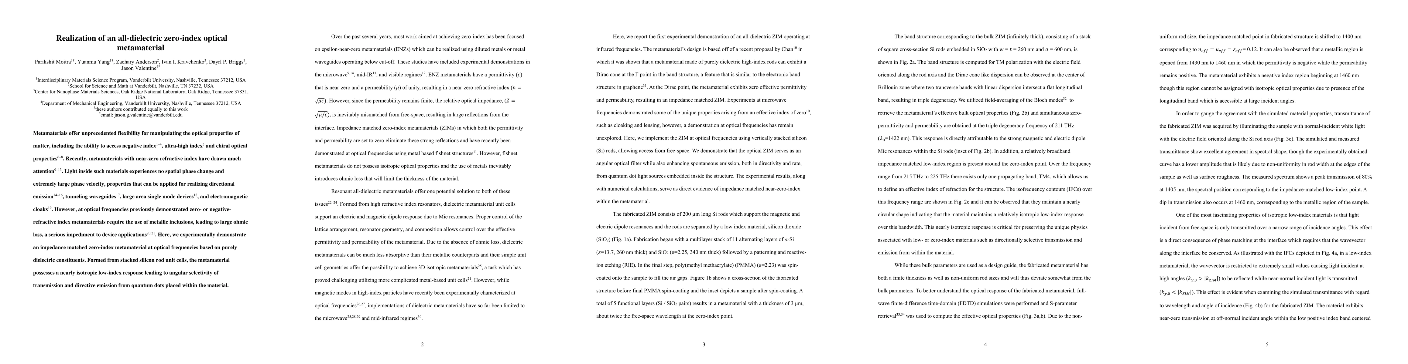 This research demonstrates an all-dielectric zero-index optical metamaterial, composed of stacked silicon rod unit cells, that exhibits no spatial phase change and extremely large phase velocity without the need for metallic inclusions, thus avoiding ohmic loss and enabling applications like directional emission and electromagnetic cloaks.
