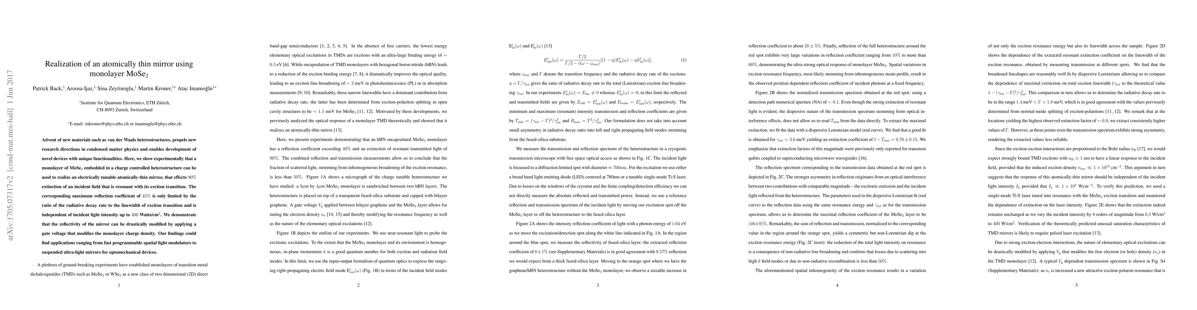 This paper demonstrates the realization of an electrically tunable atomically-thin mirror using a monolayer of MoSe2 embedded in a charge-controlled heterostructure, achieving 90% extinction of resonant incident fields. The mirror's reflectivity can be modified by gate voltage, showing potential for applications in programmable spatial light modulators and optomechanical devices.