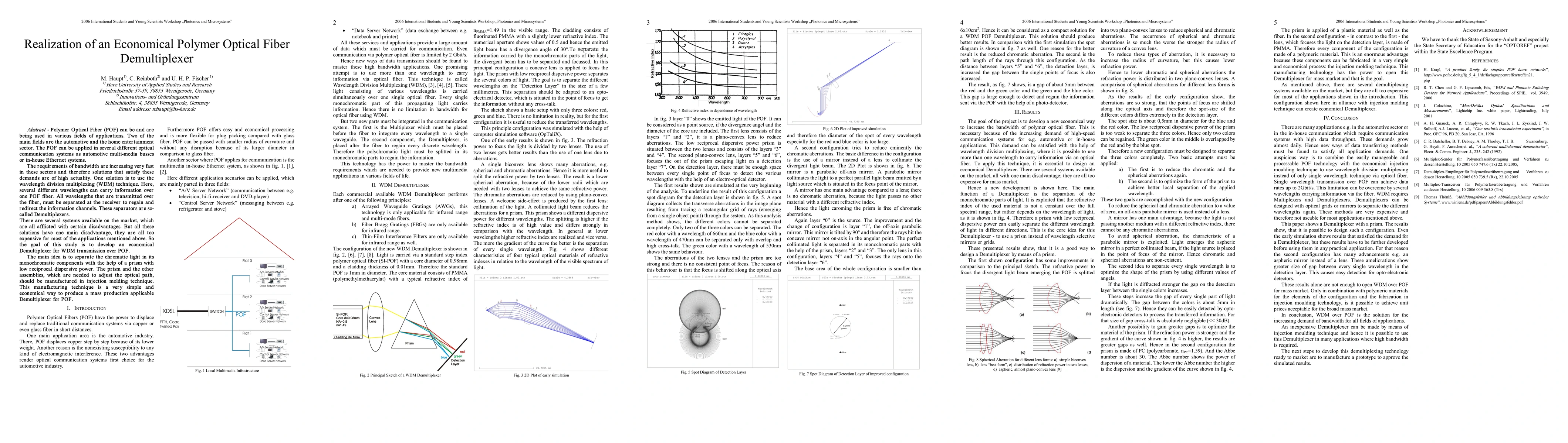 Polymer Optical Fiber (POF) can be and are being used in various fields of applications. Two of the main fields are the automotive and the home entertainment sector. The POF can be applied in several different optical communication systems as automotive multi-media busses or in-house Ethernet systems. The requirements of bandwidth are increasing very fast in these sectors and therefore solutions that satisfy these demands are of high actuality. One solution is to use the wavelength division multiplexing (WDM) technique. Here, several different wavelengths can carry information over one POF fiber. All wavelengths that are transmitted over the fiber, must be separated at the receiver to regain and redirect the information channels. These separators are so-called Demultiplexers. There are several systems available on the market, which are all afflicted with certain disadvantages. But all these solutions have one main disadvantage, they are all too expensive for most of the applications mentioned above. So the goal of this study is to develop an economical Demultiplexer for WDM transmission over POF. The main idea is to separate the chromatic light in its monochromatic components with the help of a prism with low reciprocal dispersive power. The prism and the other assemblies, which are needed to adjust the optical path, should be manufactured in injection molding technique. This manufacturing technique is a very simple and economical way to produce a mass production applicable Demultiplexer for POF.