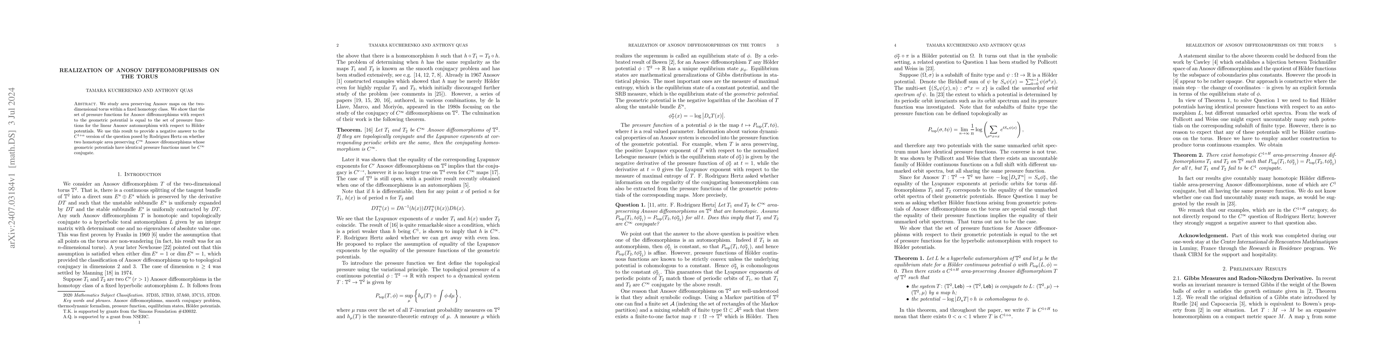 This paper investigates area-preserving Anosov maps on the torus, demonstrating that their pressure functions align with those of linear Anosov automorphisms. It concludes that homotopic $C^\infty$ Anosov diffeomorphisms with identical pressure functions are not necessarily $C^\infty$ conjugate, answering a $C^{1+\alpha}$ version of a question by Rodriguez Hertz negatively.