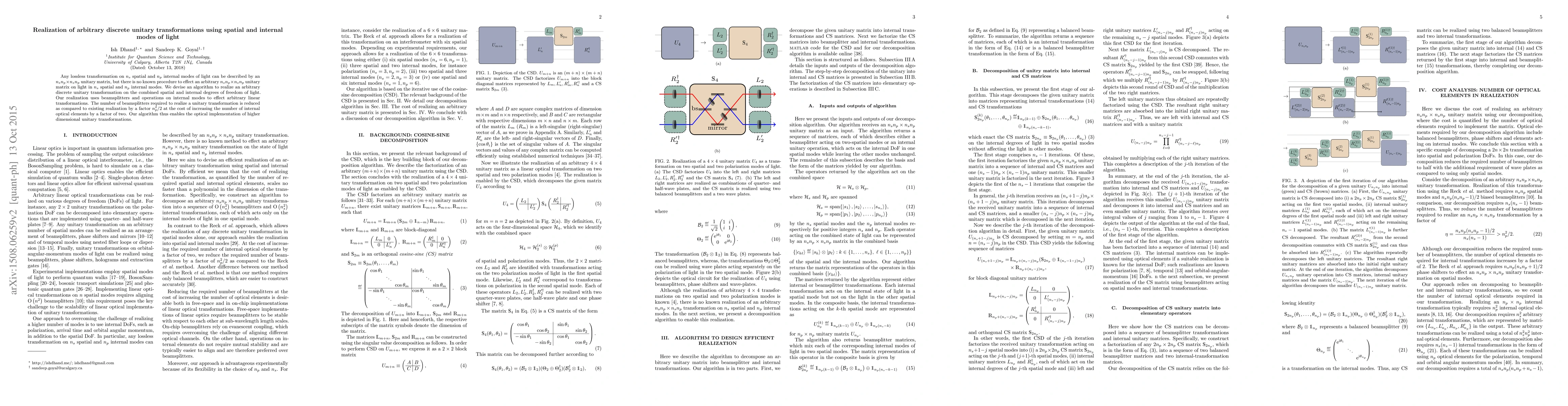 This paper presents an algorithm to achieve arbitrary discrete unitary transformations on light by combining spatial and internal modes, using beamsplitters and internal operations. The proposed method reduces the number of beamsplitters by a factor of $n_{p}^2/2$ compared to existing methods, albeit at the expense of doubling the number of internal optical elements.