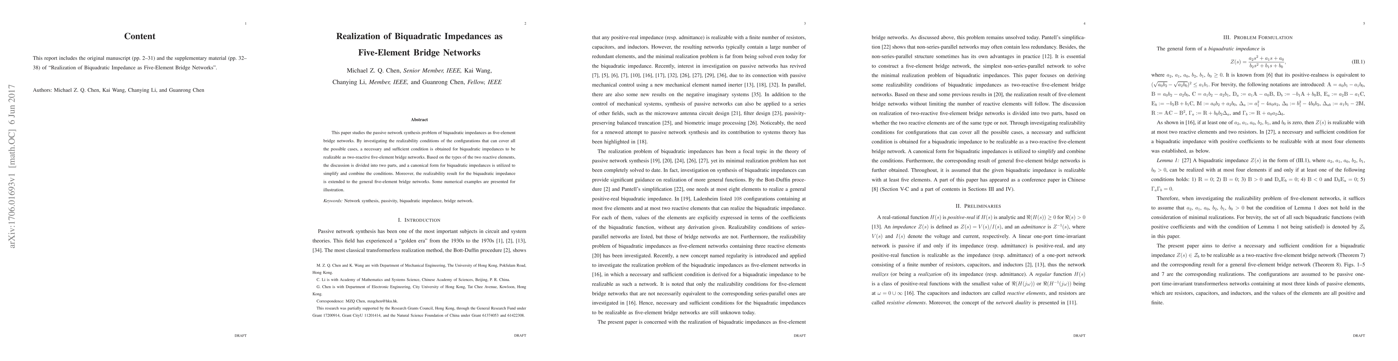 This report includes the original manuscript and the supplementary material of "Realization of Biquadratic Impedance as Five-Element Bridge Networks".
