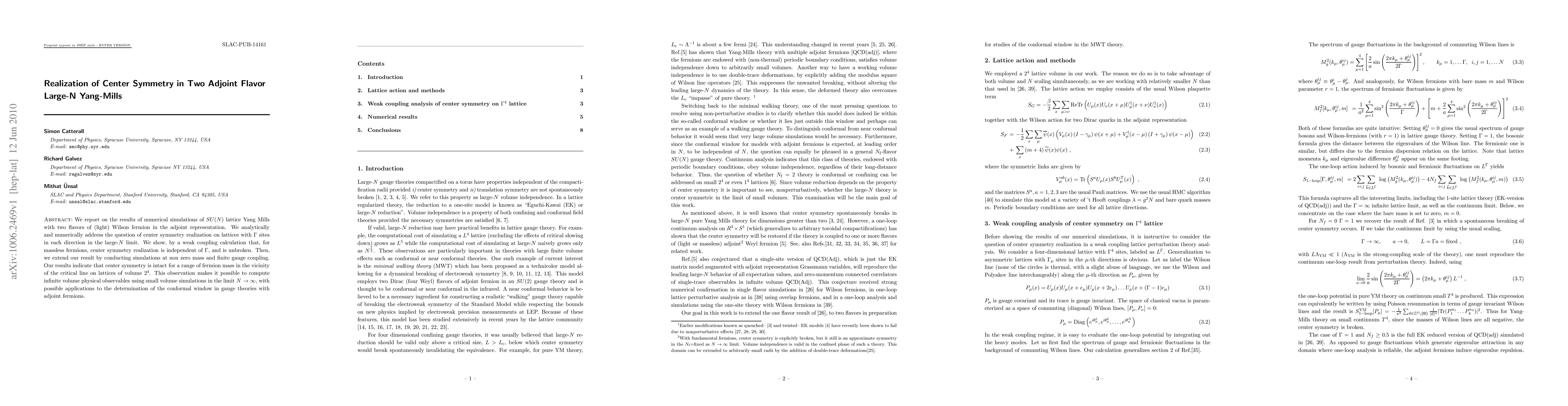 We report on the results of numerical simulations of $SU(N)$ lattice Yang Mills with two flavors of (light) Wilson fermion in the adjoint representation. We analytically and numerically address the question of center symmetry realization on lattices with $\Gamma$ sites in each direction in the large-$N$ limit. We show, by a weak coupling calculation that, for massless fermions, center symmetry realization is independent of $\Gamma$, and is unbroken. Then, we extend our result by conducting simulations at non zero mass and finite gauge coupling. Our results indicate that center symmetry is intact for a range of fermion mass in the vicinity of the critical line on lattices of volume $2^4$. This observation makes it possible to compute infinite volume physical observables using small volume simulations in the limit $N\to\infty$, with possible applications to the determination of the conformal window in gauge theories with adjoint fermions.